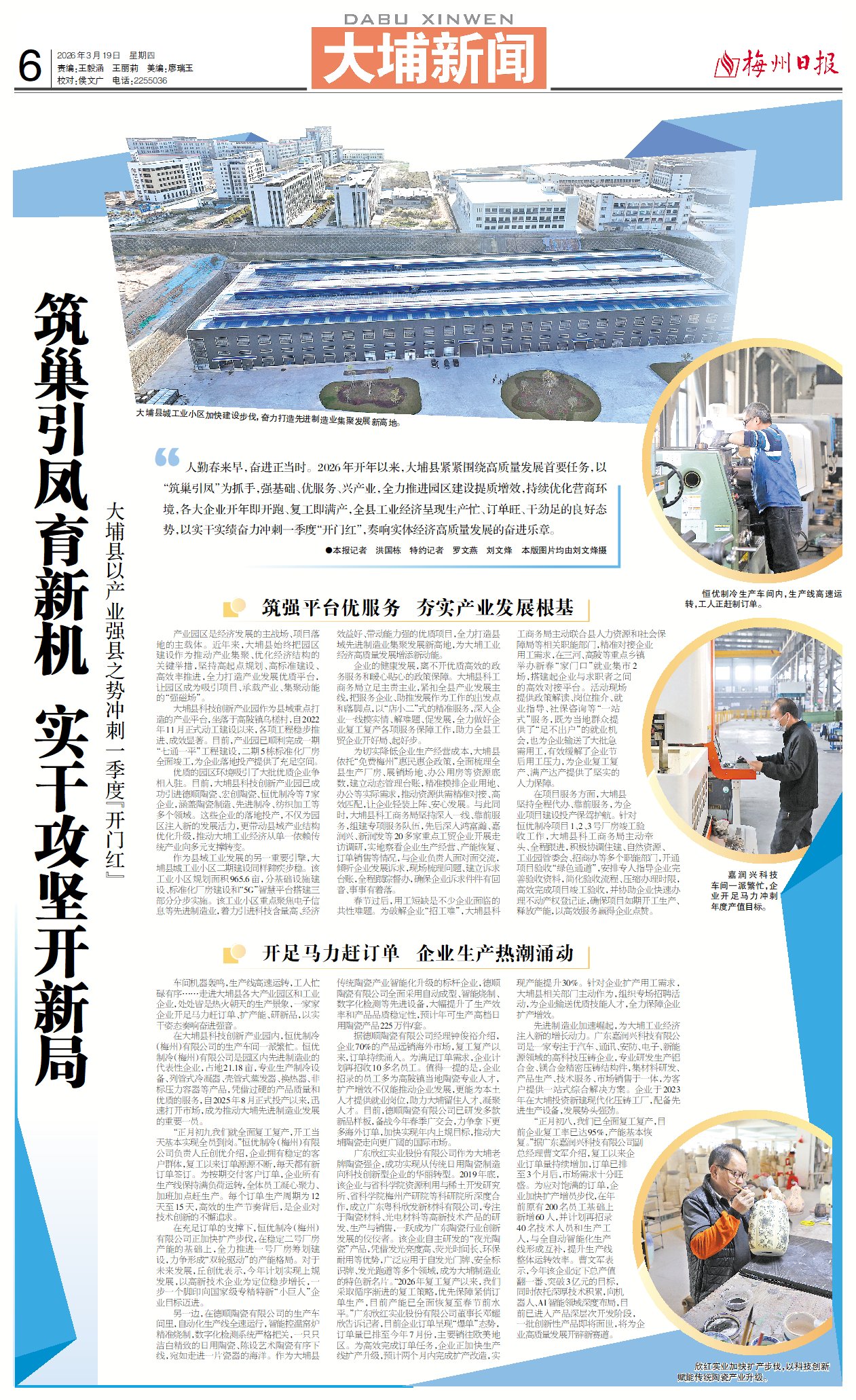 人勤春来早,奋进正当时。2026年开年以来,大埔县紧紧围绕高质量发展首要任务,以“筑巢引凤”为抓手,强基础、优服务、兴产业,全力推进园区建设提质增效,持续优化营商环境,各大企业开年即开跑、复工即满产,全县工业经济呈现生产忙、订单旺、干劲足的良好态势,以实干实绩奋力冲刺一季度“开门红”,奏响实体经济高质量发展的奋进乐章。