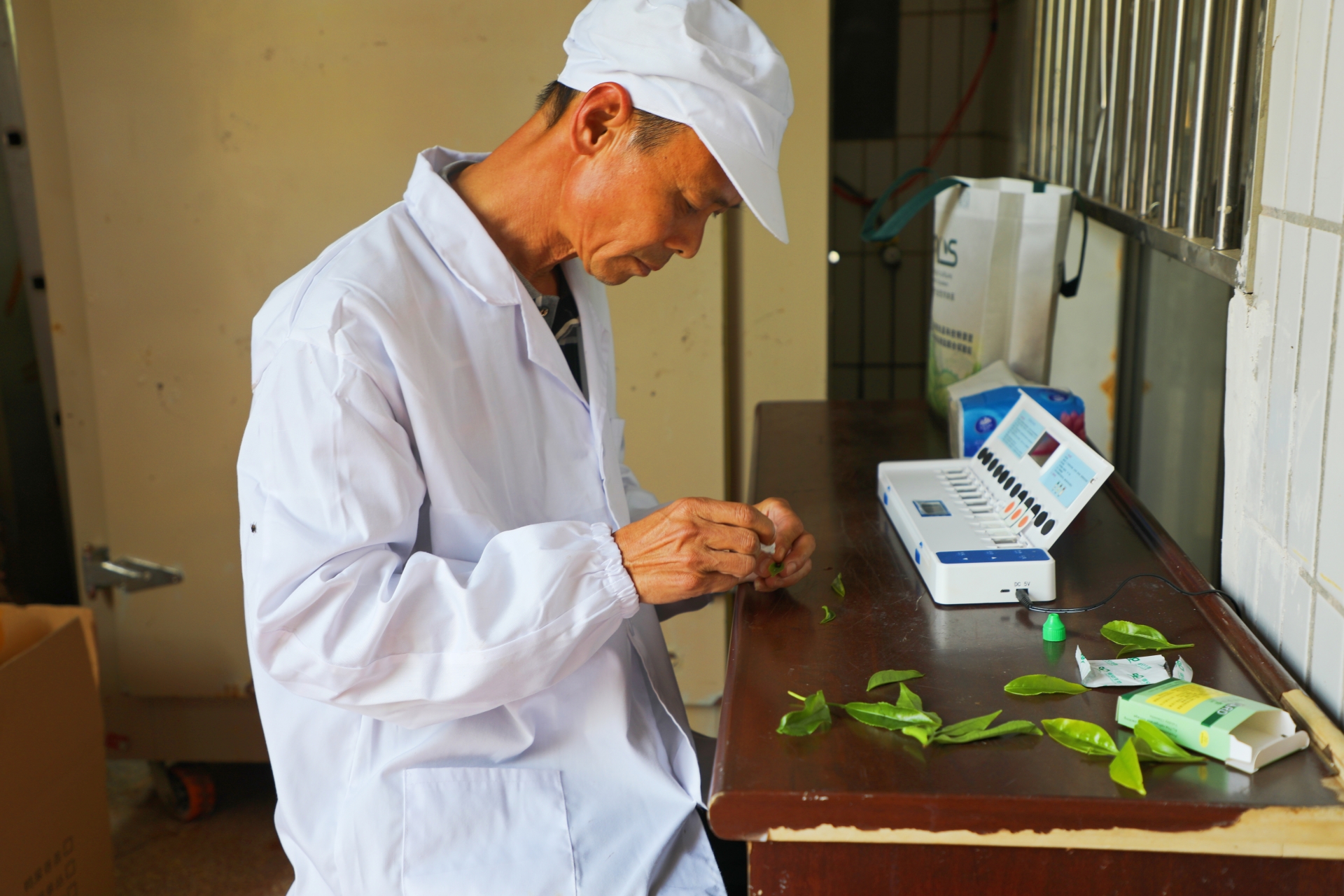 鹏发茶业有限公司的工作人员对茶叶进行品质检测(刘文烽 摄)
