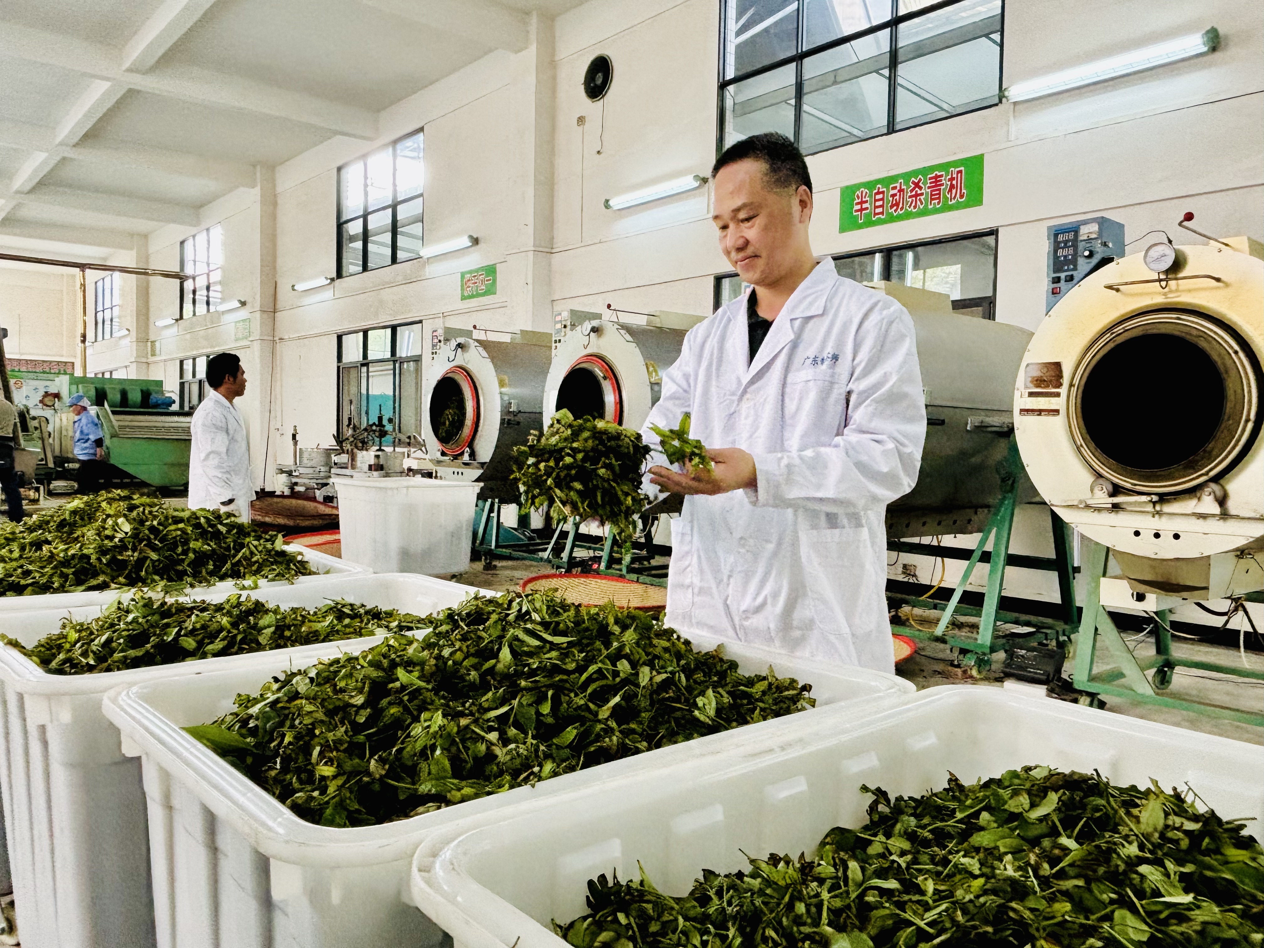 鹏发茶业负责人查看茶青晾晒情况,严把春茶品质关(刘文烽 摄)