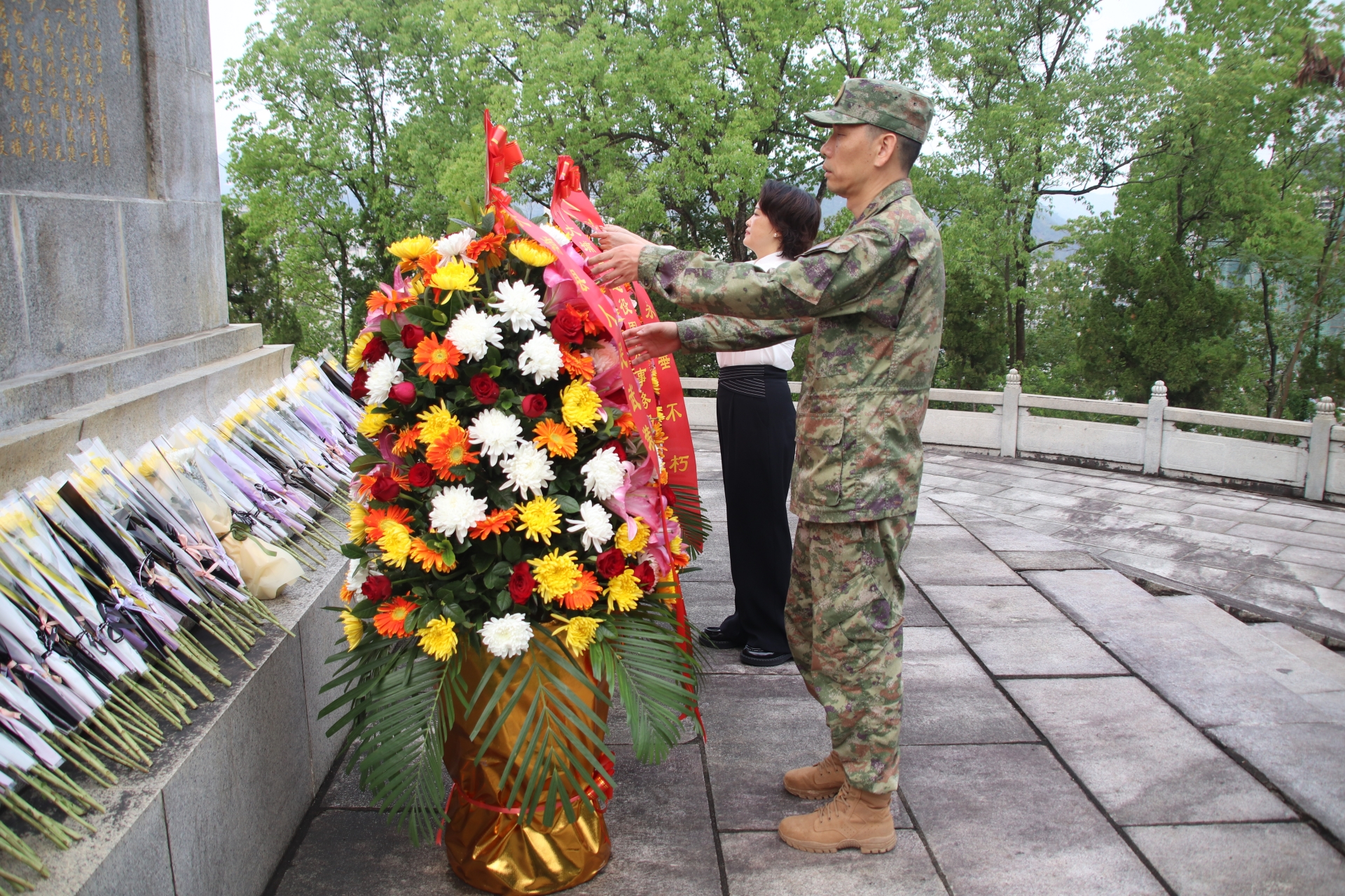 默哀毕,参与活动的军地领导缓步走向烈士纪念碑,敬献鲜花,整理绶带,向革命先烈致以最崇高的敬意。随后,全体人员依次瞻仰烈士纪念碑,重温革命先辈浴血奋战的峥嵘岁月,感悟先烈们坚贞不屈、无私奉献的革命精神。