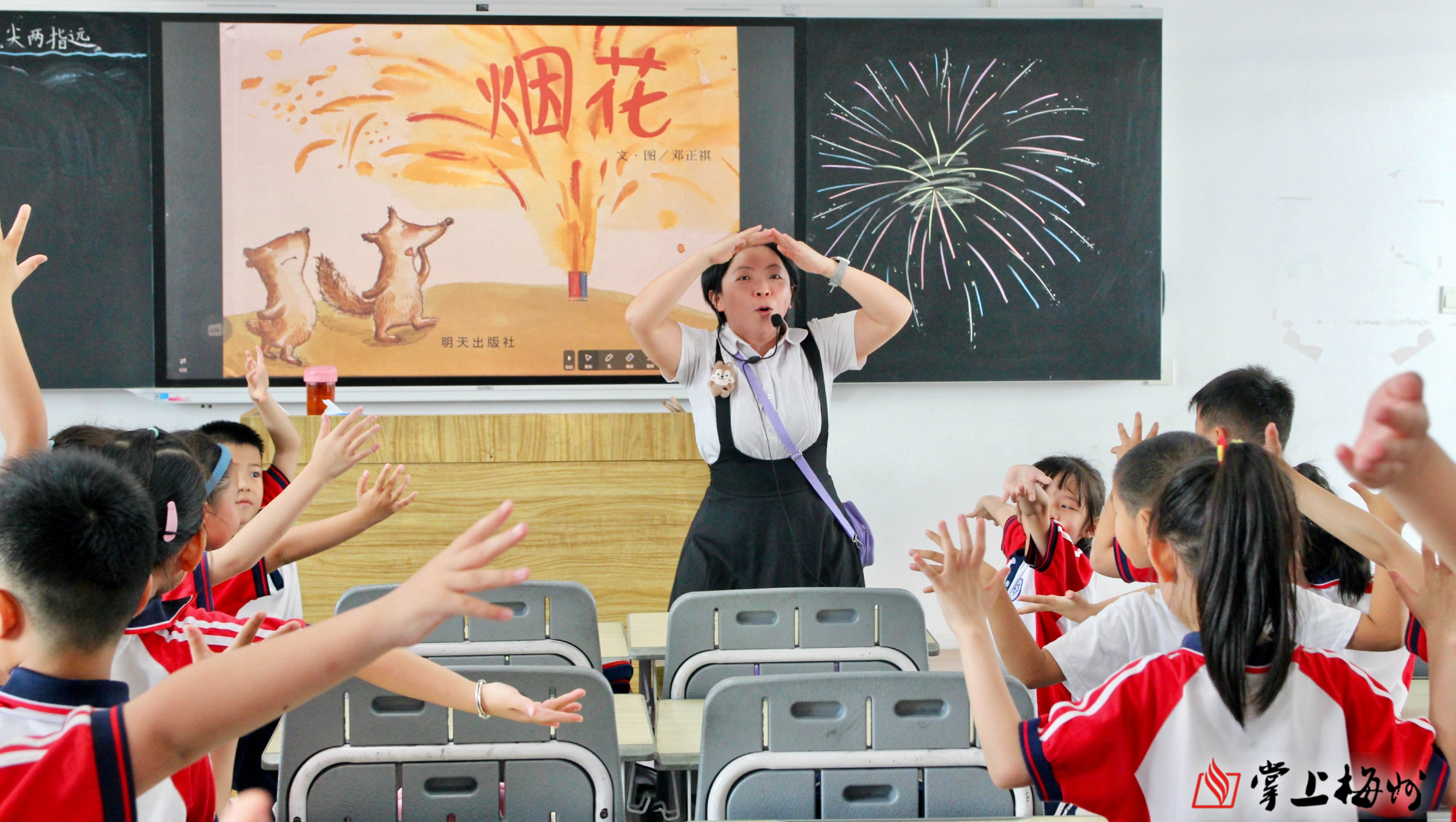 阳光透过窗户,洒进大埔县西岭实验学校的教室。来自广州的支教老师马雅君,先在黑板上勾勒出一束绽放的烟花,再打开课件、手持绘本,为孩子们开启一堂生动的故事课。她用抑扬顿挫的讲述、生动传神的表情,将故事徐徐铺展。讲到动情处,她引导孩子们用肢体模仿烟花绽放,原本腼腆拘谨的孩子纷纷舒展手臂,课堂里满是纯真欢笑。