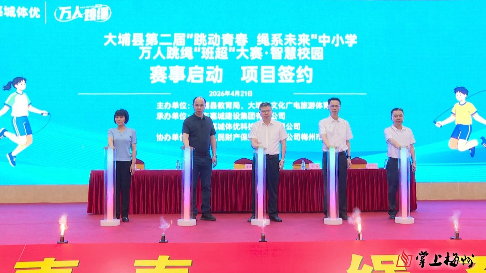 掌上梅州讯 4月21日上午,大埔县第二届“跳动青春 绳系未来”中小学万人跳绳“班超”大赛启动会暨智慧校园项目签约仪式在大埔县西岭实验学校篮球馆举行。大埔县委常委、副县长李定华出席活动。