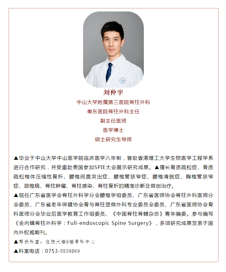 刘仲宇博士:擅长骨质疏松症、骨质疏松椎体压缩性骨折、腰椎间盘突出症、腰椎管狭窄症、腰椎滑脱症、胸椎管狭窄症、颈椎病、脊柱肿瘤、脊柱感染、脊柱骨折的精准诊断及微创治疗。