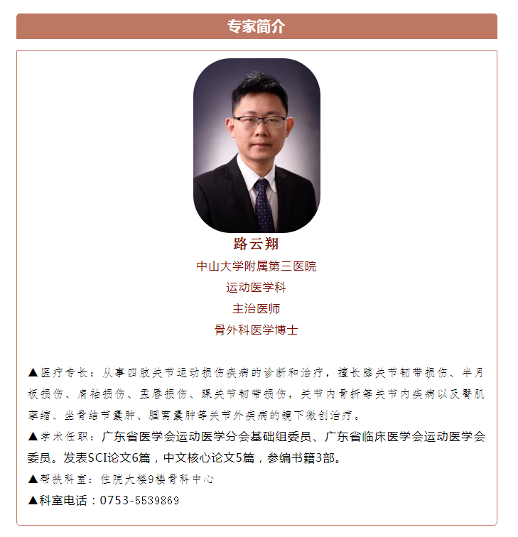 路云翔博士:擅长膝关节韧带损伤、半月板损伤、肩袖损伤、盂唇损伤、踝关节韧带损伤,关节内骨折等关节内疾病以及臀肌挛缩、坐骨结节囊肿、腘窝囊肿等关节外疾病的镜下微创治疗。