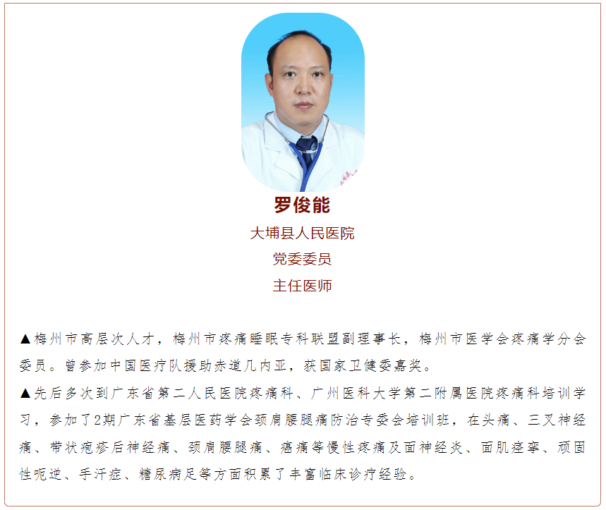 线上预约挂号:选择【疼痛科门诊】→【罗俊能主任医师】