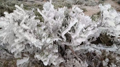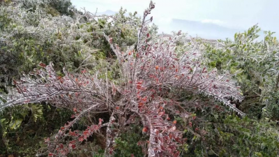 来到山鸿图嶂,只见到处是白茫茫一片,在树枝上,石头下挂满冰雪雾凇,银装素裹,分外妖娆,在冰雪雾凇的装扮下,一棵棵树木犹如梨花开,就像梦幻般的童话世界。