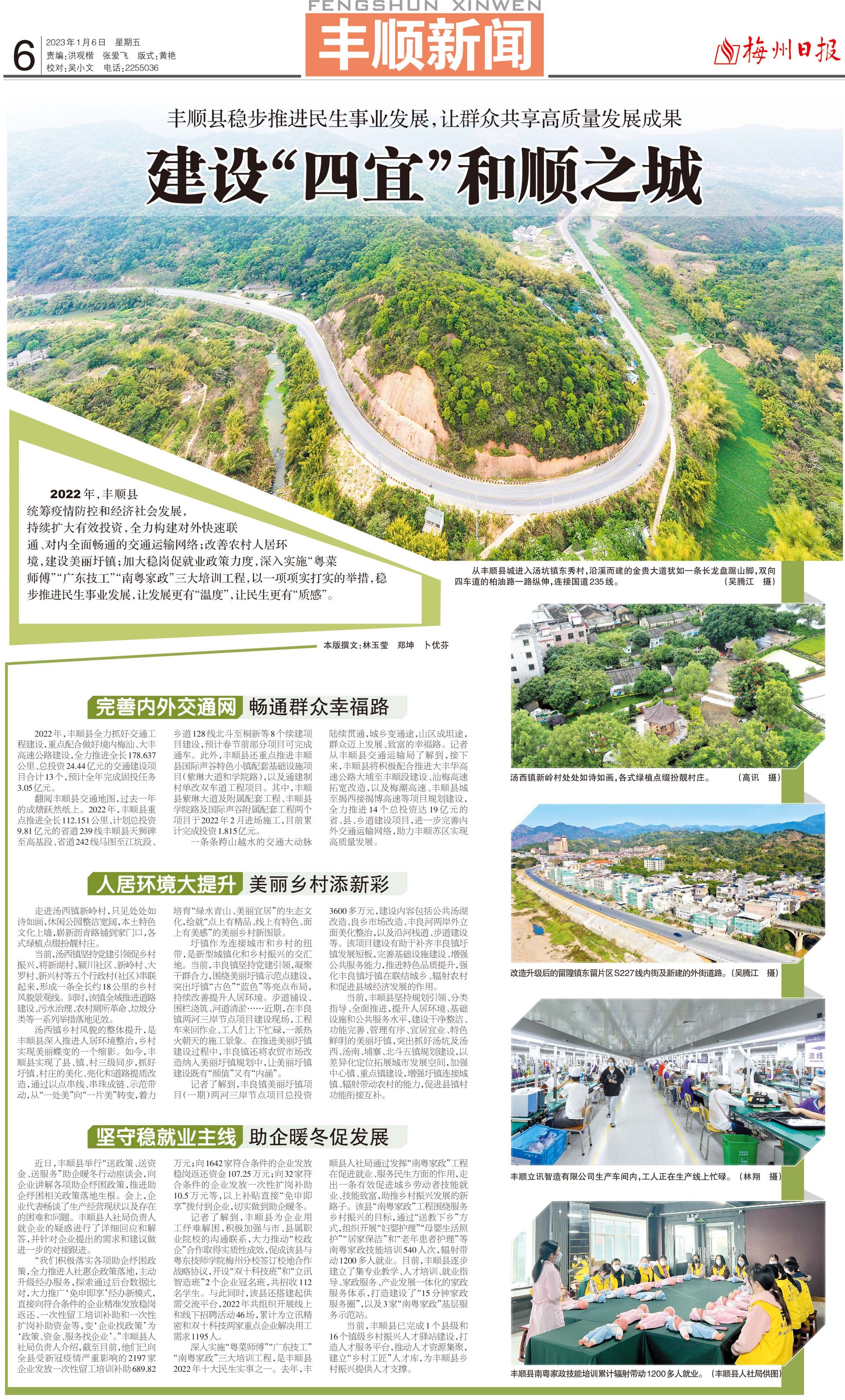 2022年,丰顺县统筹疫情防控和经济社会发展,持续扩大有效投资,全力构建对外快速联通、对内全面畅通的交通运输网络;改善农村人居环境,建设美丽圩镇;加大稳岗促就业政策力度,深入实施“粤菜师傅”“广东技工”“南粤家政”三大培训工程,以一项项实打实的举措,稳步推进民生事业发展,让发展更有“温度”,让民生更有“质感”。
