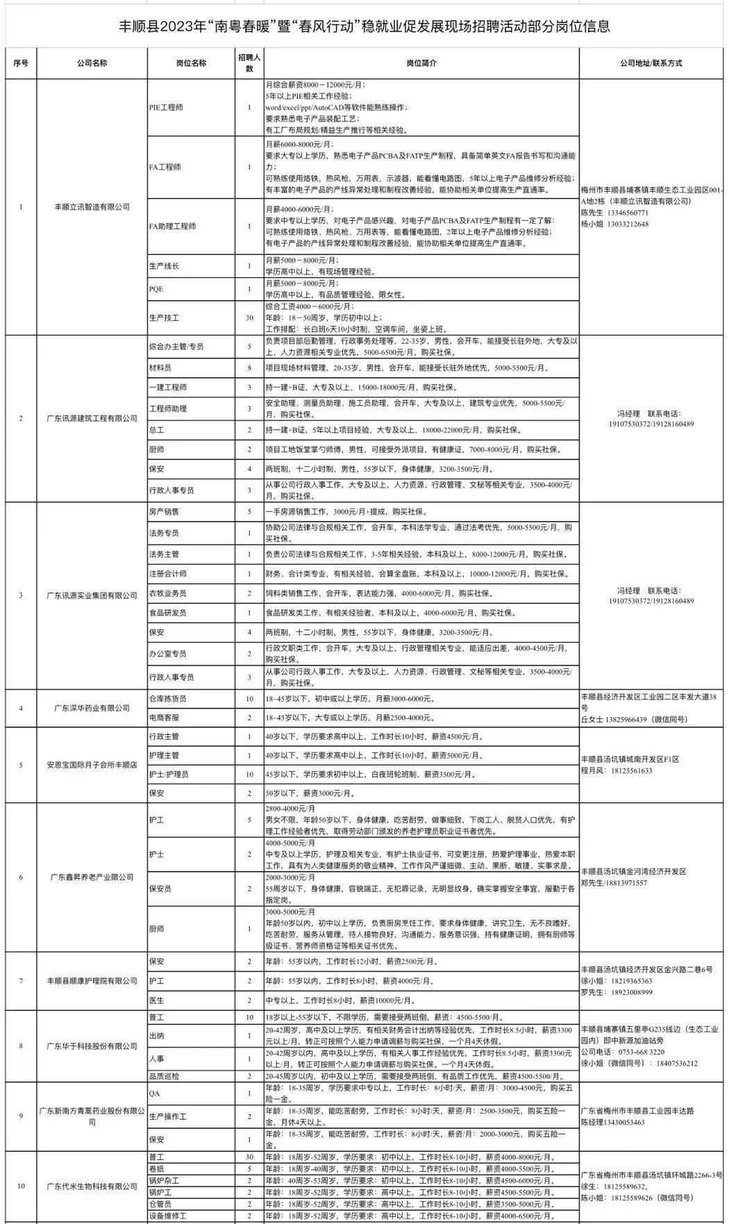 金兔迎春,好岗任选。为切实做好2023年南粤春暖、春风行动、就业援助月和春运期间农民工有序流动等有关工作,进一步发挥好人社部门在稳就业、保民生、促发展中的重要作用,解决“企业招工难”“居民就业难”的问题,丰顺县人社局联合农业农村、退役军人事务、总工会、团县委、残联和妇联等部门举办丰顺县2023年“南粤春暖”暨“春风行动”稳就业促发展现场招聘活动,活动期间组织进场企业23家以上,提供800个(次)以上就业岗位,岗位多,薪资高,福利齐,诚邀广大求职人员踊跃参加!