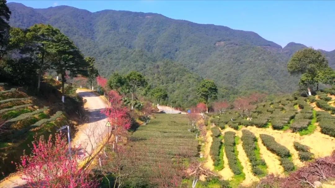 放眼望去,一树树艳丽的杏花,极尽妖娆,挂满枝头,在翠绿茶园的映衬下显得格外娇嫩。
