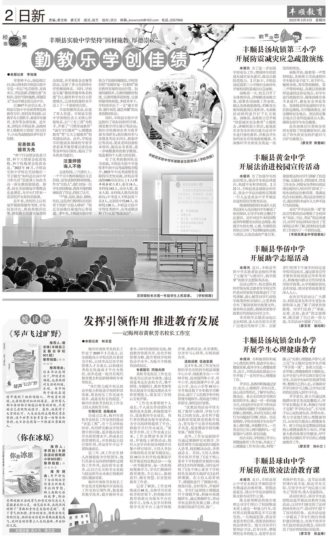 丰富的德育活动,拓宽了育人渠道。丰顺县实验中学围绕社会主义核心价值体系,以“三有三讲”为抓手,开展了“习惯养成教育”“诚实守信教育”“心理健康教育”等“五大主题教育”校风建设活动。此外,学校还不时邀请各领域的专家学者前来开展禁毒宣讲活动等各种知识讲座,提高了学生的各项意识。