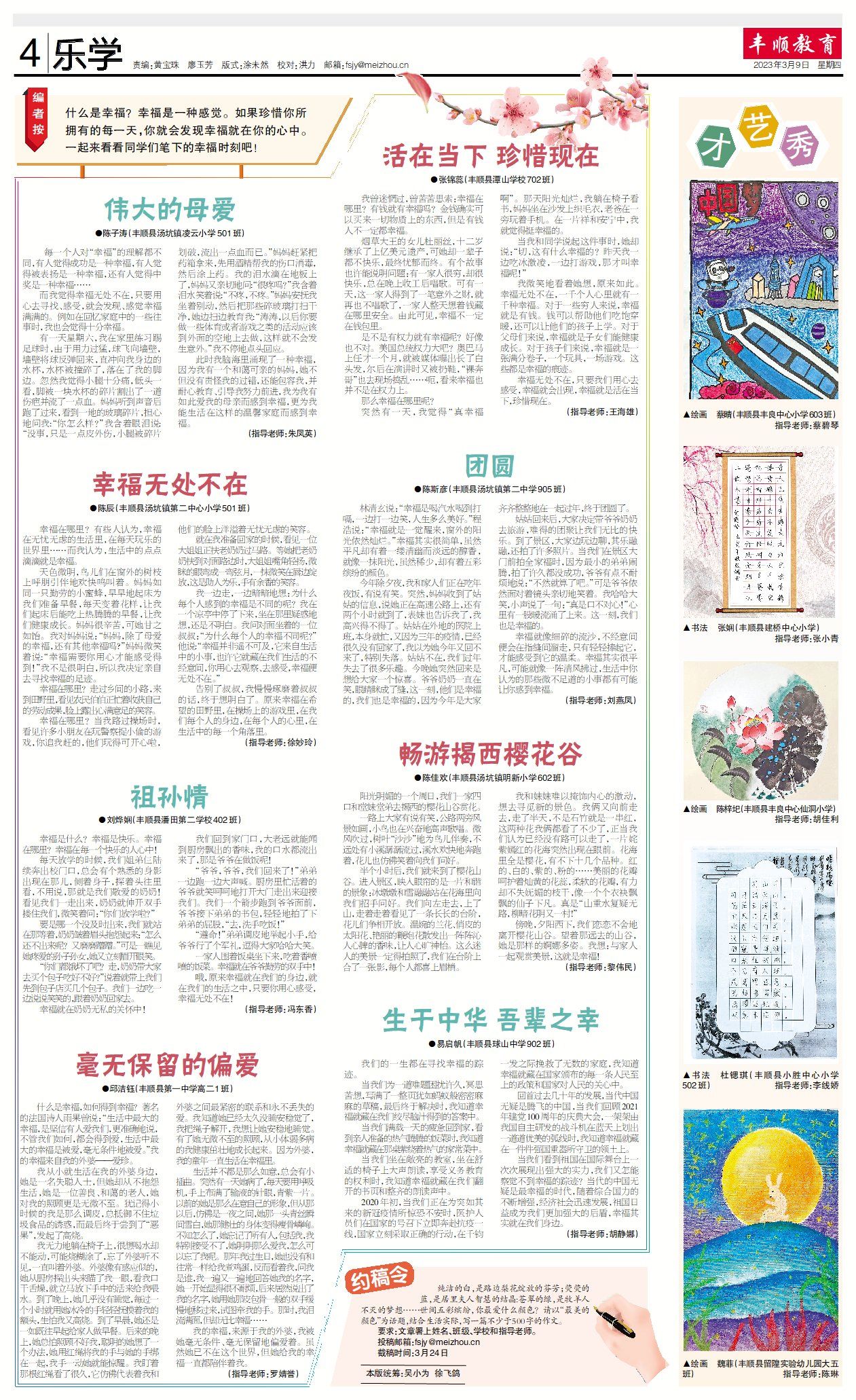 幸福无处不在,只要我们用心去感受,幸福就会出现,幸福就是活在当下,珍惜现在。(指导老师:王海雄)