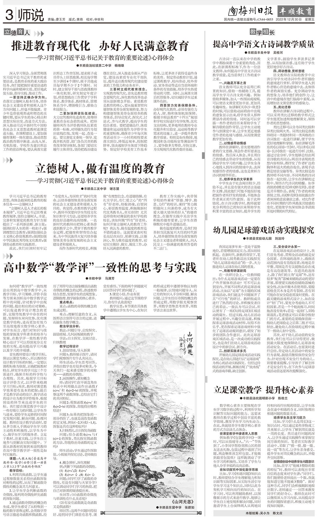 四要努力完善保障条件。办好现代化教育,必须有强有力的人、财、物和体制机制保障。根据丰顺县教育“十四五”规划和学校实际进行有序统筹,优化支出结构,更多地用在教师专业化提升和实验室、运动场等教学需求的设施上,进一步提升教育教学质量。特别是如生物园、地理园和各功能场室等薄弱环节上,要争取多方筹资,尽快完善,为实现现代化教育奠好基础。