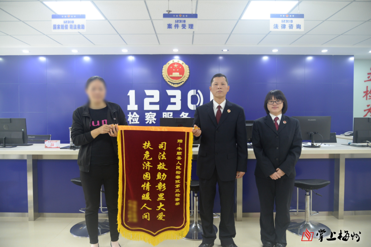 掌上梅州讯 “谢谢检察机关对我们一家的关心,我们会慢慢好起来的……”近日,马女士来到丰顺县检察院,将一面绣着“司法救助彰显大爱,扶危济困情暖人间”的锦旗送到办案检察官手中,感谢检察机关开展司法救助帮其家庭缓解困境。