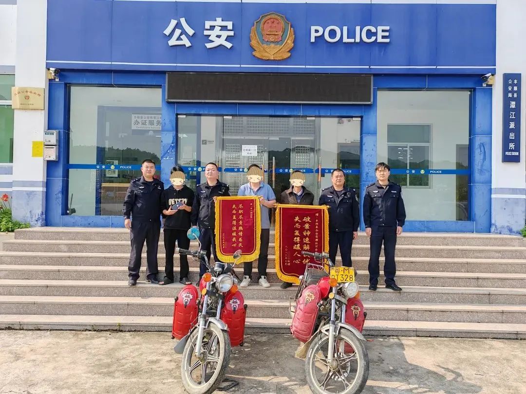 4月10日,潭江镇廖先生、邓先生满怀欣喜分别带着锦旗来到潭江派出所,对丰顺县潭江派出所快速破案及时追赃挽损表示衷心的感谢。与此同时,潭江派出所发还被盗摩托车2辆、手机1部。