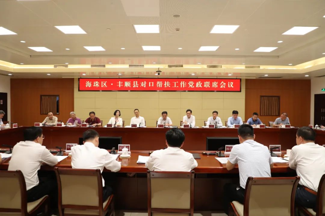 4月20日,海珠区·丰顺县对口帮扶工作党政联席会议在海珠区召开,会议强调要深入学习贯彻习近平总书记视察广东的重要讲话精神,大力实施省“百县千镇万村高质量发展工程”,扎实做好对口帮扶、乡村振兴等各项工作,推动合作机制不断完善、合作领域不断拓展、合作平台不断做实,携手推进丰顺经济高质量发展。广州市海珠区委书记蔡澍,丰顺县委书记张志锋出席会议并讲话。海珠区委副书记、政法委书记卢兆华主持会议。