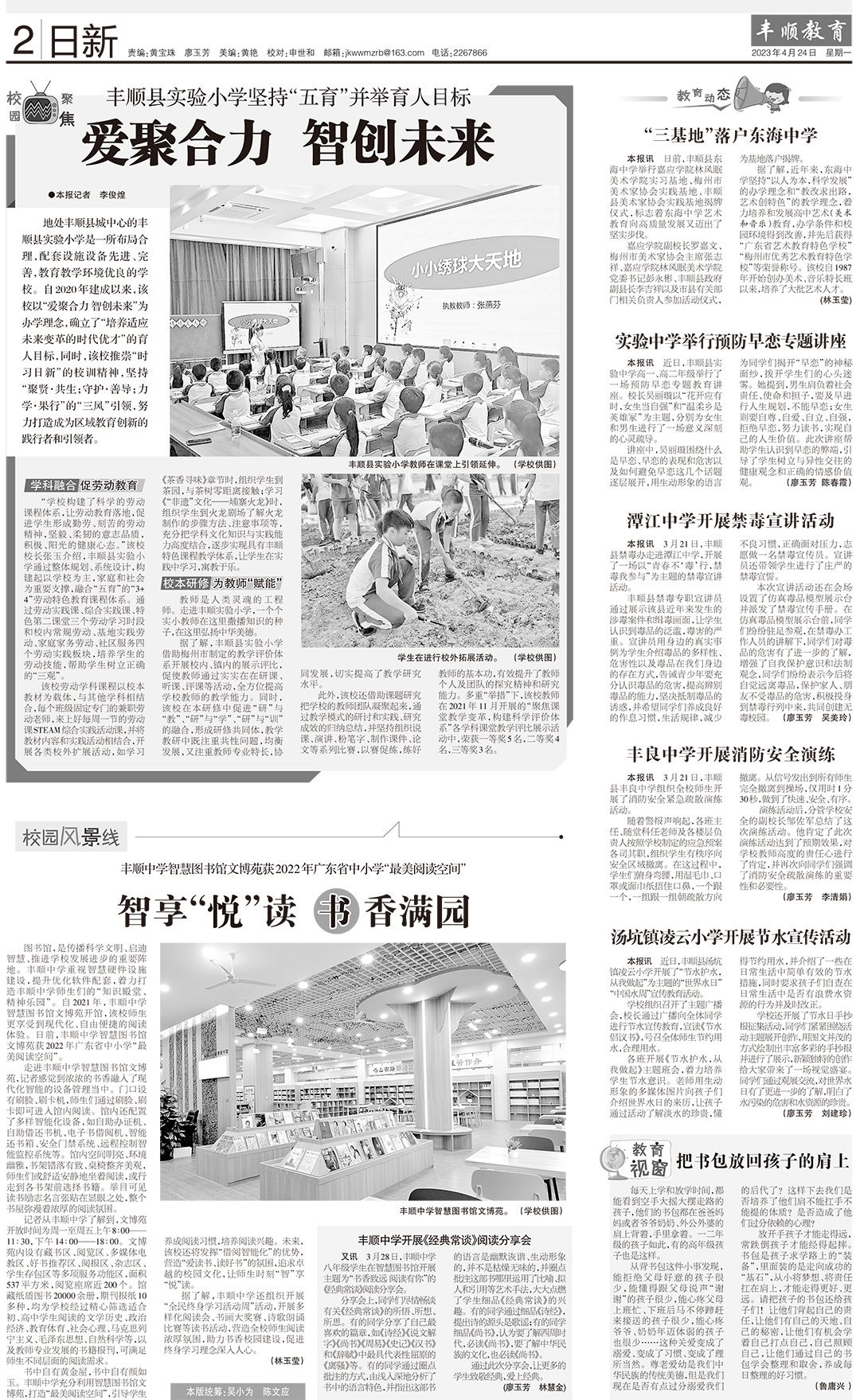 地处丰顺县城中心的丰顺县实验小学是一所布局合理,配套设施设备先进、完善,教育教学环境优良的学校。自2020年建成以来,该校以“爱聚合力 智创未来”为办学理念,确立了“培养适应未来变革的时代优才”的育人目标,同时,该校推崇“时习日新”的校训精神,坚持“聚贤·共生;守护·善导;力学·果行”的“三风”引领,努力打造成为区域教育创新的践行者和引领者。