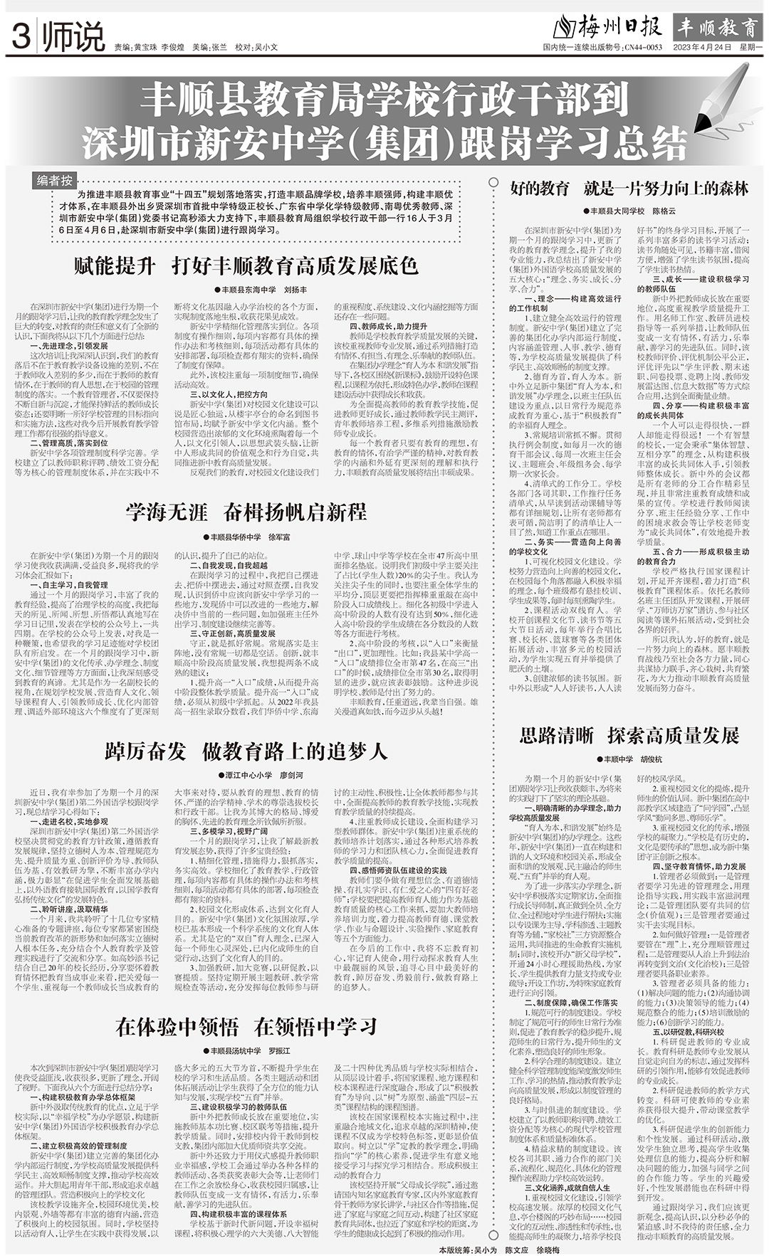 丰顺县教育局学校行政干部到深圳市新安中学(集团)跟岗学习总结