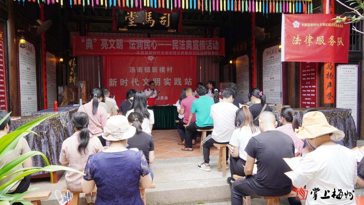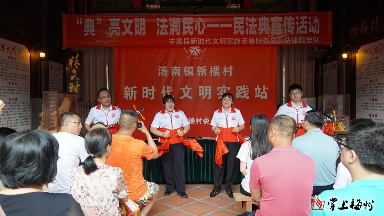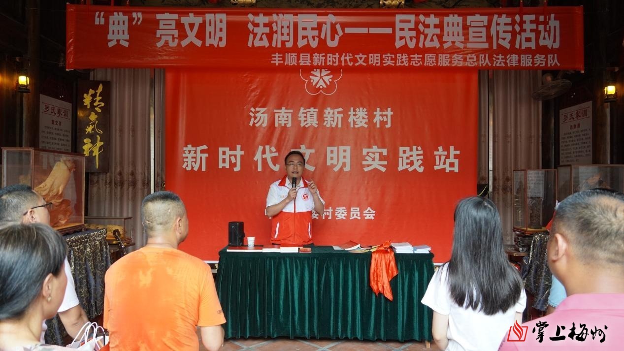 掌上梅州讯 18日,丰顺县新时代文明实践志愿服务总队法律服务队到汤南镇新楼村新时代文明实践站开展“典”亮文明 法润民心——民法典宣传活动。新楼村“两委”干部、“法律明白人”“学法用法示范户”、村民代表等参加了本次活动。