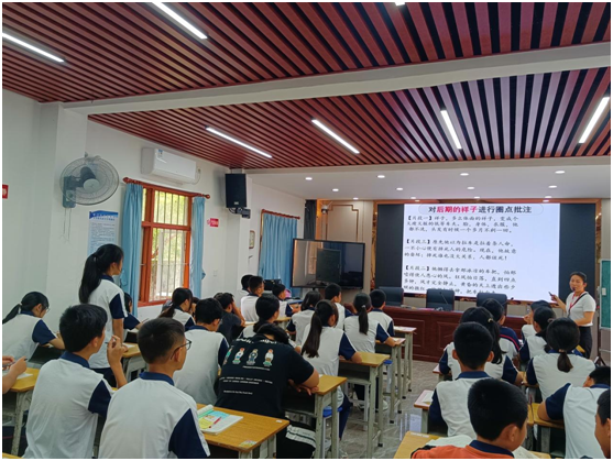 接着,工作室的两位入室学员分别开展了精彩纷呈的送教活动。钟翠萍老师的课《赏析文本细节,分析人物形象——以<骆驼祥子>为例》,以视频展示《骆驼祥子》故事梗概引入课堂,引导学生回顾小说内容,为课堂起到良好铺垫。这节课关注文本细节,通过文本的解读,从人物描写角度、修辞角度、环境描写角度分析祥子的形象;再学以致用,分别选取三个文段针对性实践;最后延伸拓展,运用2023年梅州市质检中关于《骆驼祥子》的题目进行解析,让学生感知中考名著题型的解答方法。教师循循善诱,讲练结合,及时点拨释疑的教学方式,对学生掌握解题技巧起到很好的指引作用。