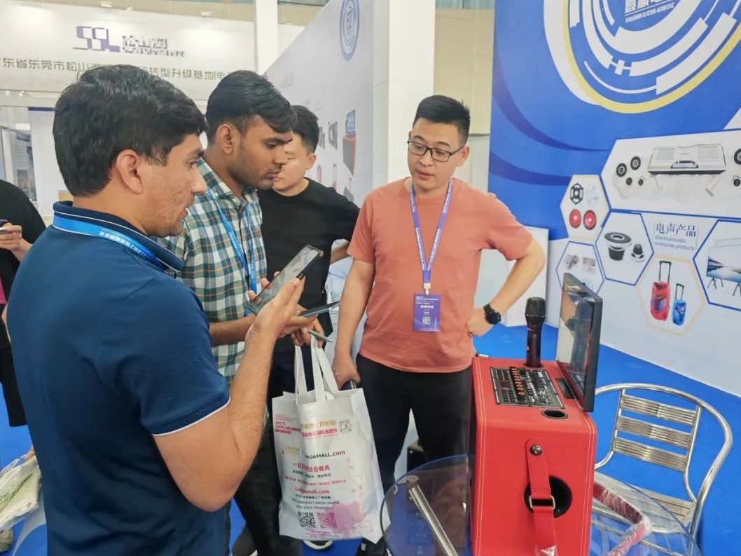 在基地展位前,吸引不少国内外采购商驻足咨询、洽谈。其中,万圣公司产品便携式蓝牙户外音响备受青睐。