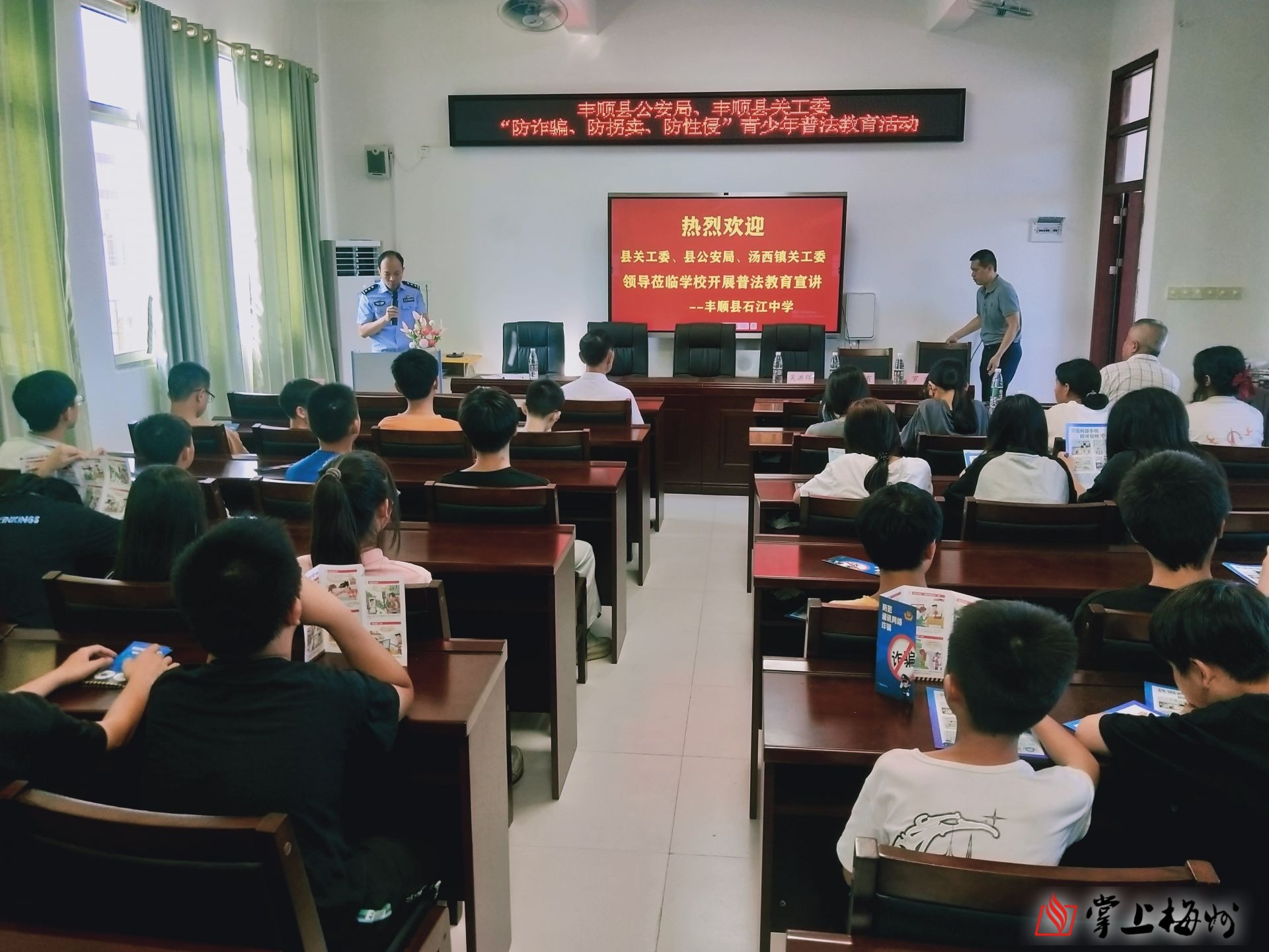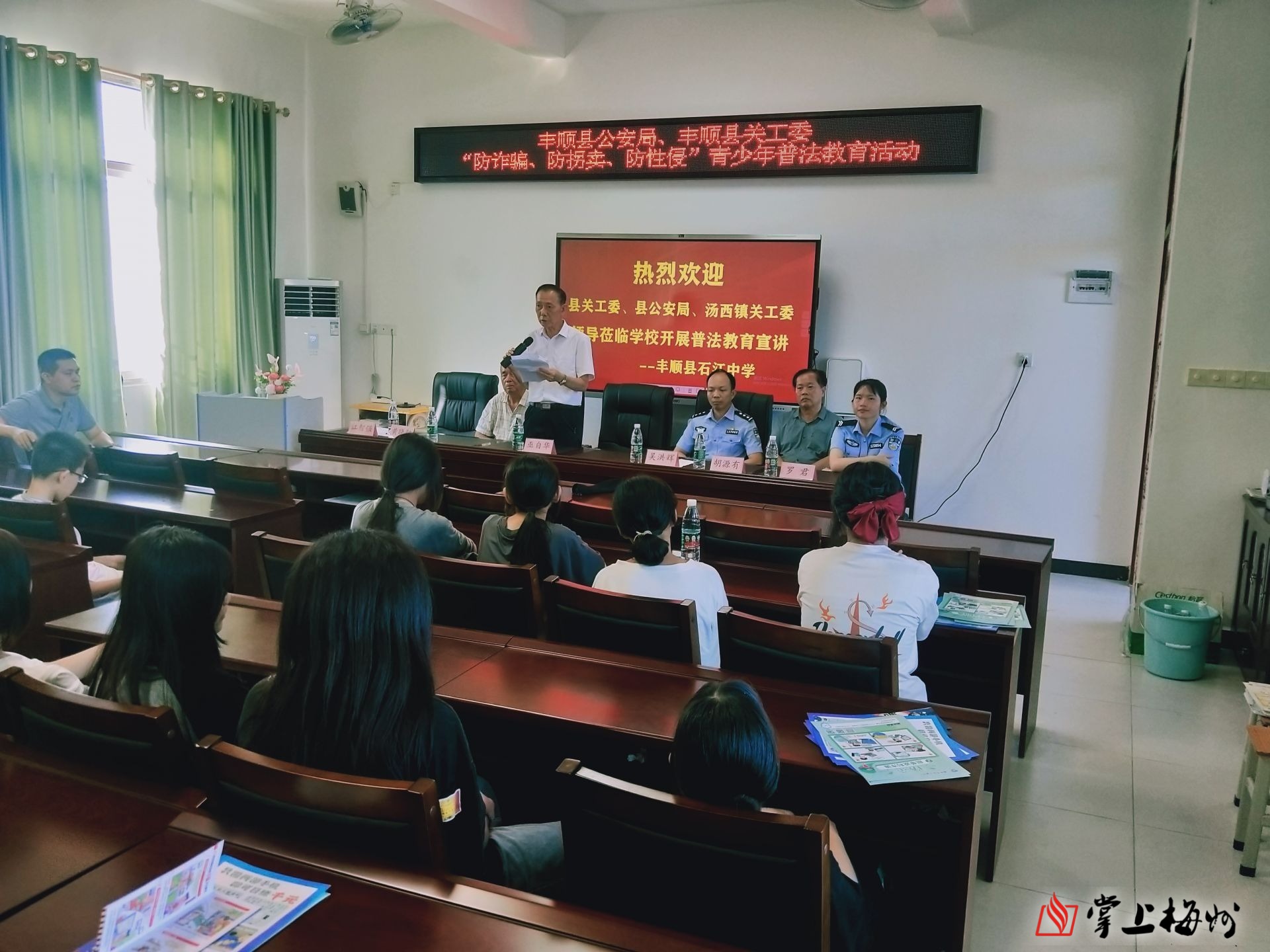 掌上梅州讯 6月20日,丰顺县关工委联合县公安局在汤西镇石江中学开展“防诈骗、防拐卖、防性侵”青少年普法教育活动。县关工委、县公安局负责同志,汤西镇关工委相关负责同志及汤西镇石江中学师生代表近80人参加了活动。
