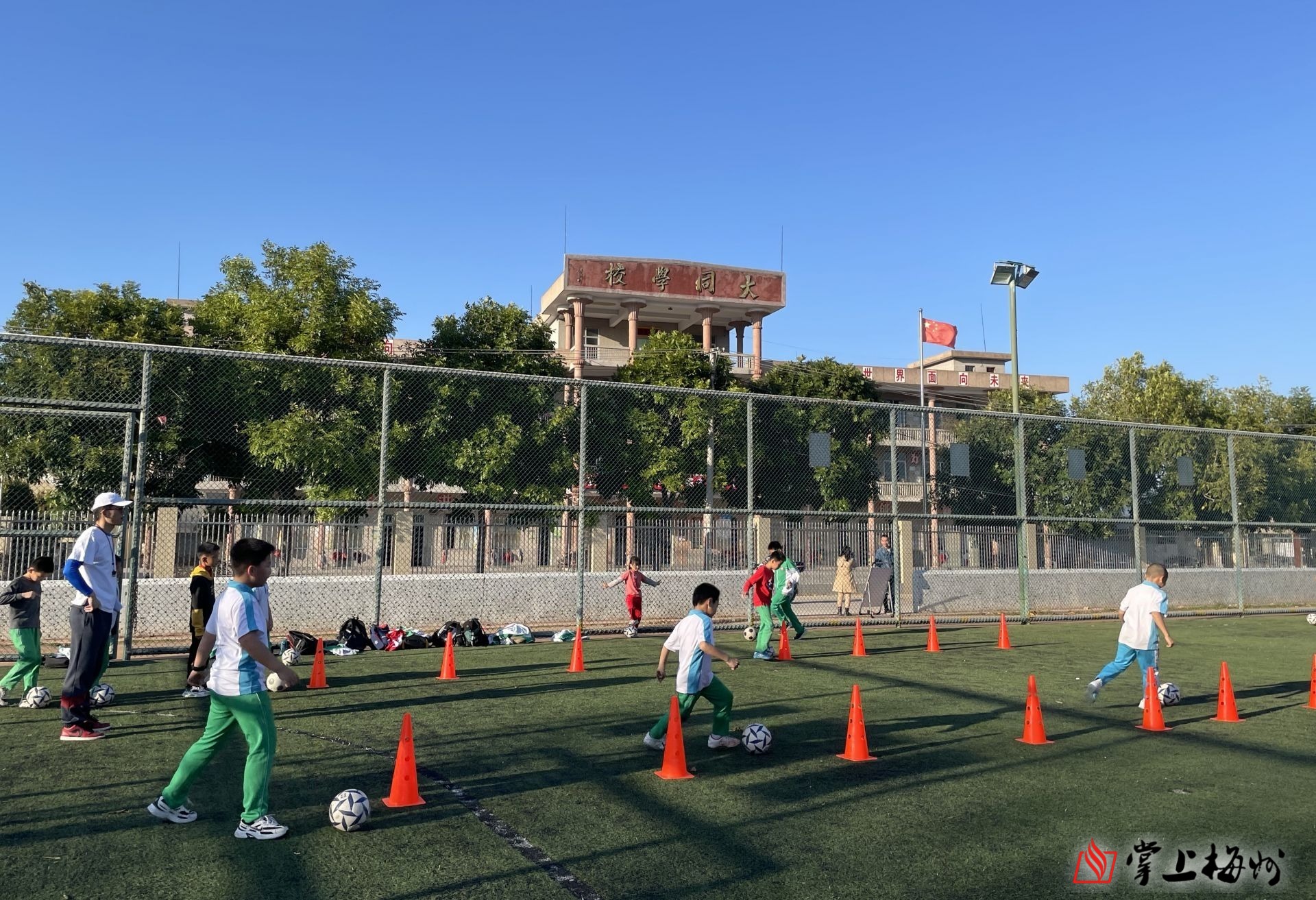 汤坑镇第二中心小学的同学们在绿茵草地上练习足球。(学校供图)