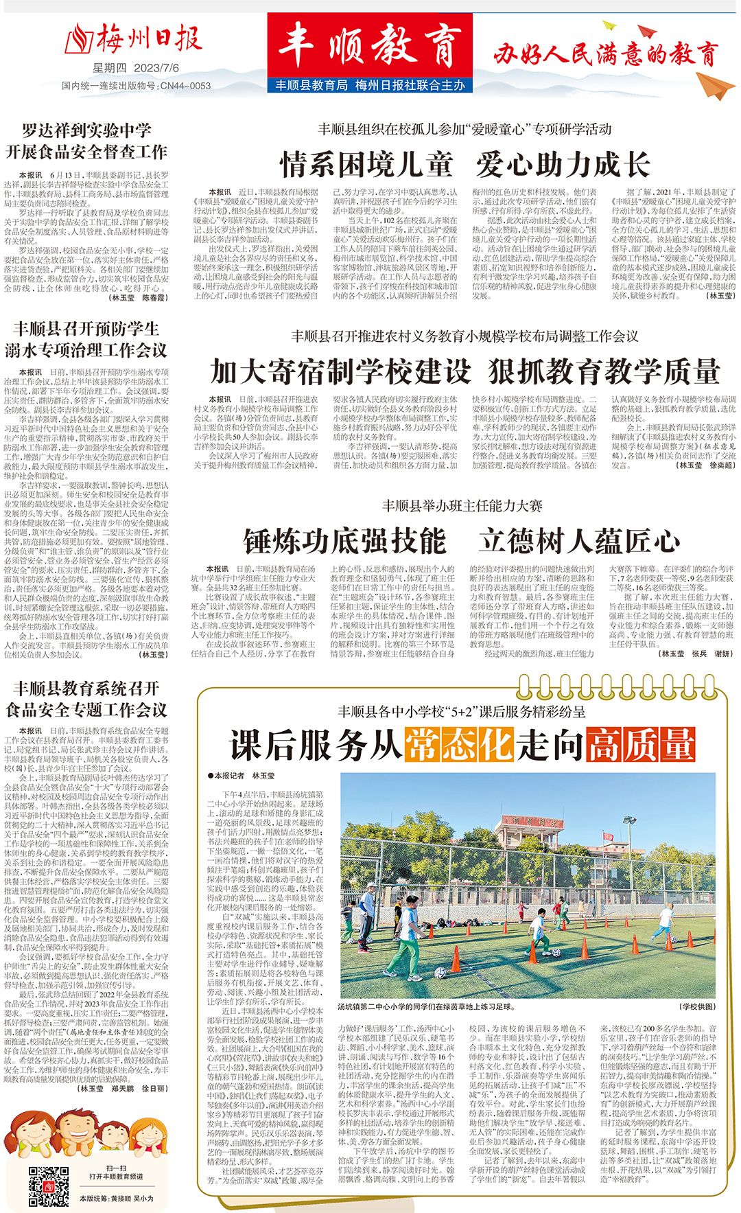 自“双减”实施以来,丰顺县高度重视校内课后服务工作,结合各校办学特色、资源状况和学生、家长实际,采取“基础托管+素质拓展”模式打造特色亮点。其中,基础托管主要对学生进行作业辅导、疑难解答;素质拓展则是将各校特色与课后服务有机衔接,开展文艺、体育、劳动、阅读、兴趣小组及社团活动,让学生们学有所乐,学有所长。