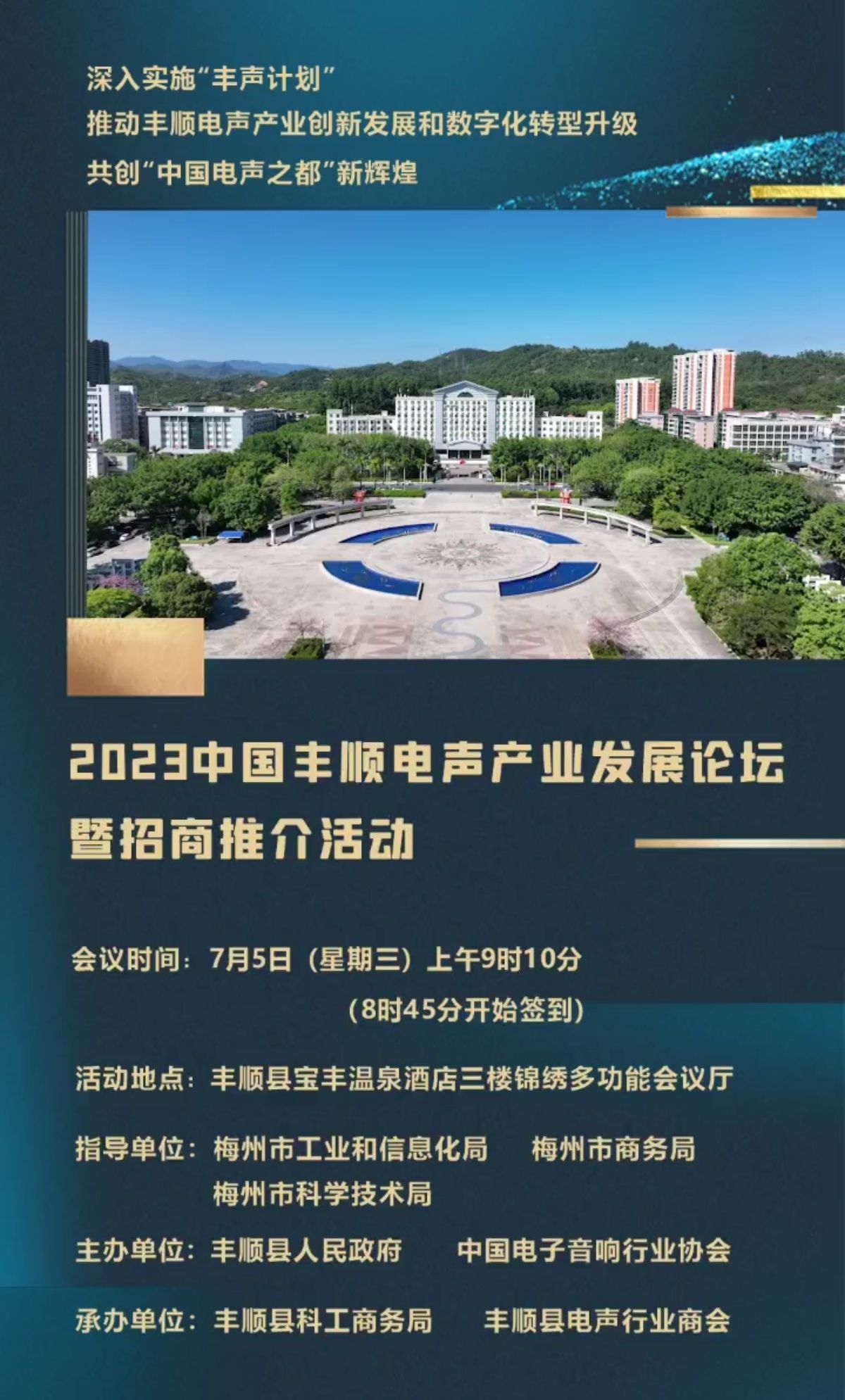 掌上梅州讯 7月5日,2023中国丰顺电声产业发展论坛暨招商推介活动将在宝丰温泉酒店三楼锦绣多功能会议厅召开,深入实施“丰声计划”,推动丰顺电声产业创新发展和数字化转型升级。