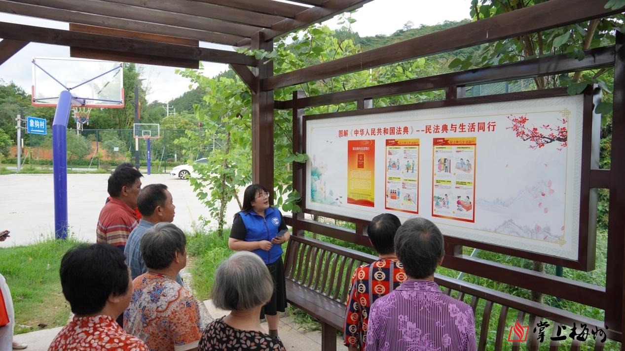 普法志愿服务队还前往埔寨镇采芝村黄山法治公园实地了解情况并开展普法宣传。黄山法治公园以满足群众法治需求为主线,结合乡村公园建设,围绕习近平法治思想、民法典等重点内容,将廉政建设、乡风文明创建、法治文化建设有机结合,打造特色鲜明的法治文化公园。普法志愿者们还向过往群众和在长廊中纳凉的村民派发民法典折页、乡村振兴促进法、食品安全宣传折页等普法宣传资料,进一步提升群众学法尊法守法用法意识。