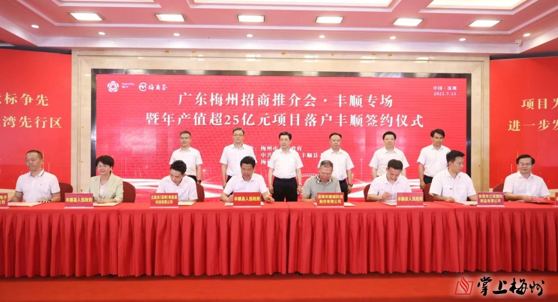 王晖在代表梅州市委、市政府致辞中指出,作为融湾入海的桥头堡,梅州正深入学习贯彻习近平总书记视察广东重要讲话、重要指示精神,认真落实省委十三届三次全会精神和“1310”具体部署,全力推进苏区融湾先行区建设,集中精力推动高质量发展。今天的梅州蓄势待发、前景无限,为广大企业投资兴业提供了广阔空间。真诚邀请广大企业家拥抱梅州振兴发展新机遇,选择梅州、投资梅州,携手前行、相互成就,共享苏区发展新机遇,成为彼此的最佳合伙人,实现双向奔赴、合作共赢。希望各签约企业认真履行投资协议,选优配强项目团队,严格按进度、按规范、按质量推进项目建设,铆足干劲、开足马力,推动签约项目早投产、早见效,形成更多的实物工作量;丰顺县要牢固树立“一切围着项目转、一切围着项目干”的理念,服务保障好企业用地、用工、用能、融资等需求,让企业家安心投资、安稳发展。市委、市政府将坚持做到“无事不扰、有事能找”,坚定支持所有在梅投资兴业、合法经营的企业和企业家扎根发展。
