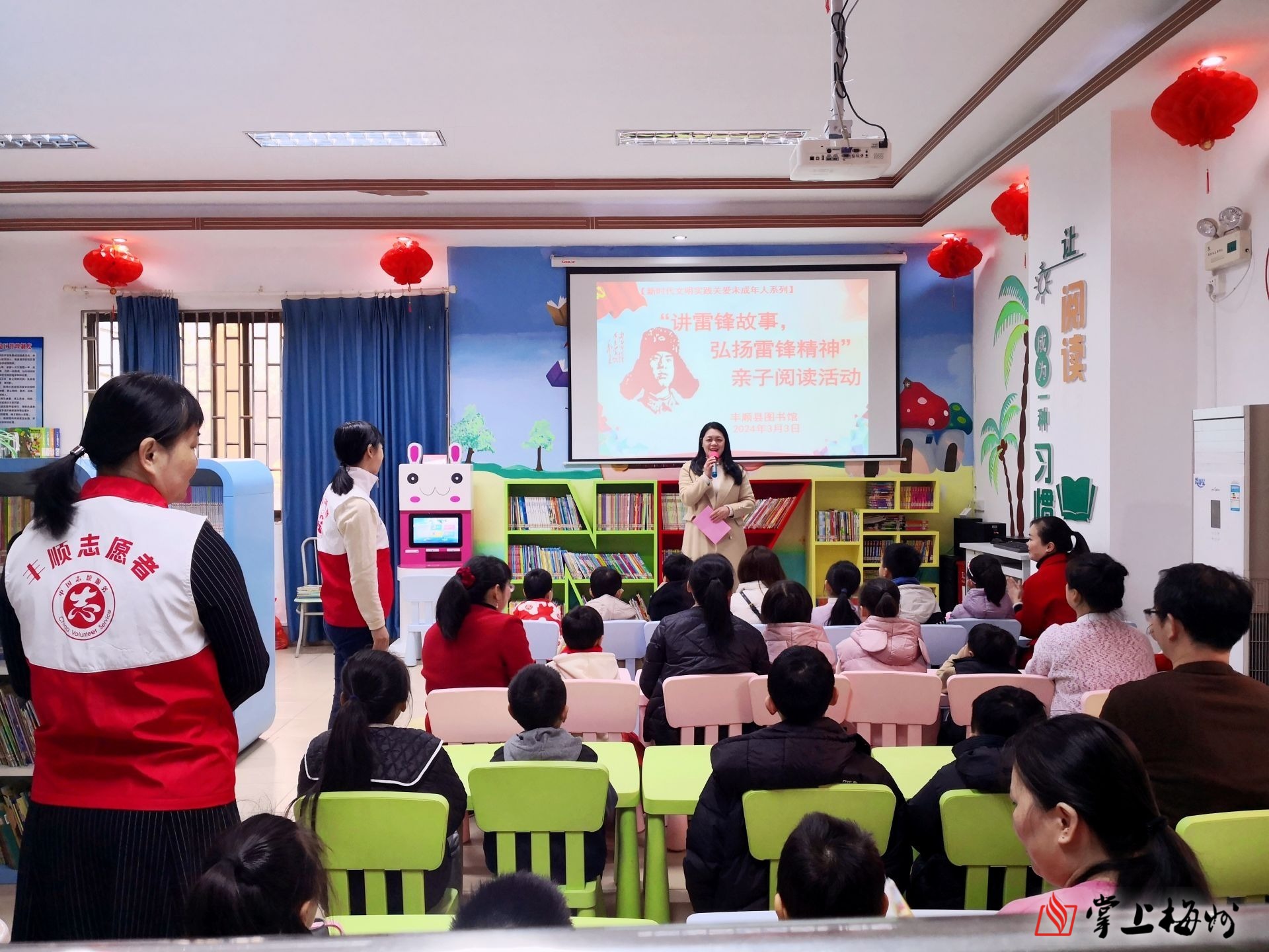 掌上梅州讯 在3月5日“学雷锋纪念日”来临之际,丰顺县图书馆于2024年3月3日上午开展【新时代文明实践关爱未成年人系列】之“讲雷锋故事,弘扬雷锋精神”亲子阅读活动,活动共有18组家庭参与,活动由黄丽珍副馆长主持,阅读推广人黄美灵授课。