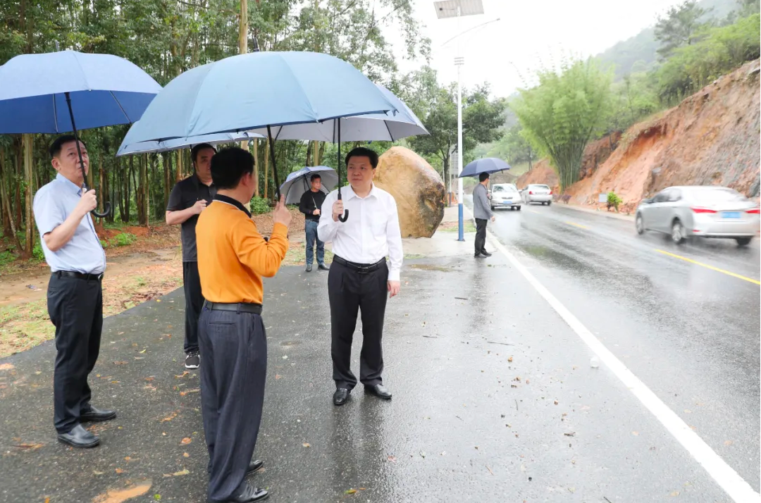 图为县委书记张志锋在G235国道汤坑东联路段道路塌方点检查督导道路交通安全