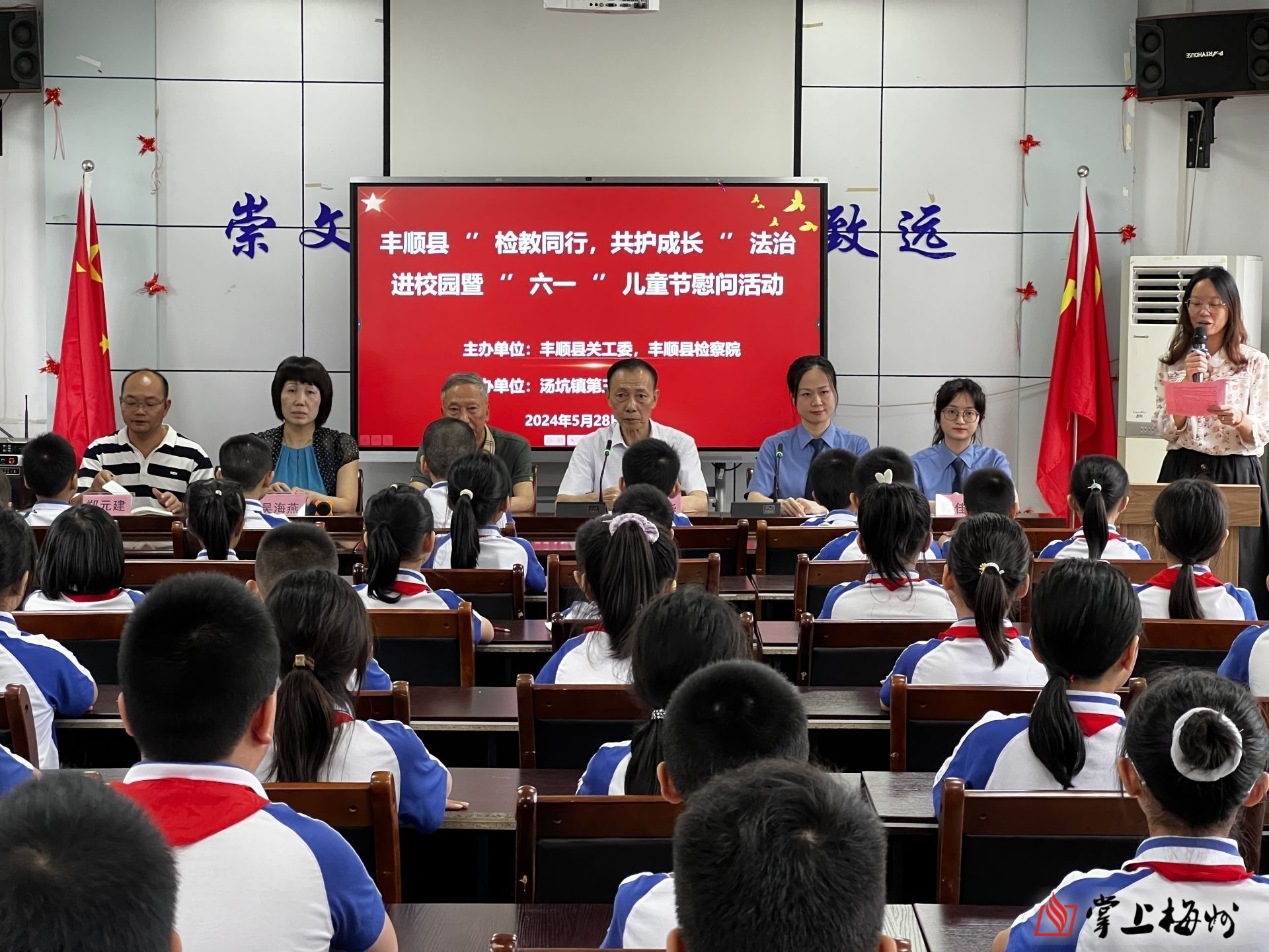 掌上梅州讯 5月28日,丰顺县关工委联合县检察院,到汤坑镇第三小学开展“检教同行、共护成长”法治进校园暨“六一”儿童节慰问活动。县关工委常务副主任巫自华,副主任梁干辉、黄晓阳,县检察院未成年人检察办公室主任徐丹红,以及汤坑镇第三小学全校师生共1400多人参加活动。