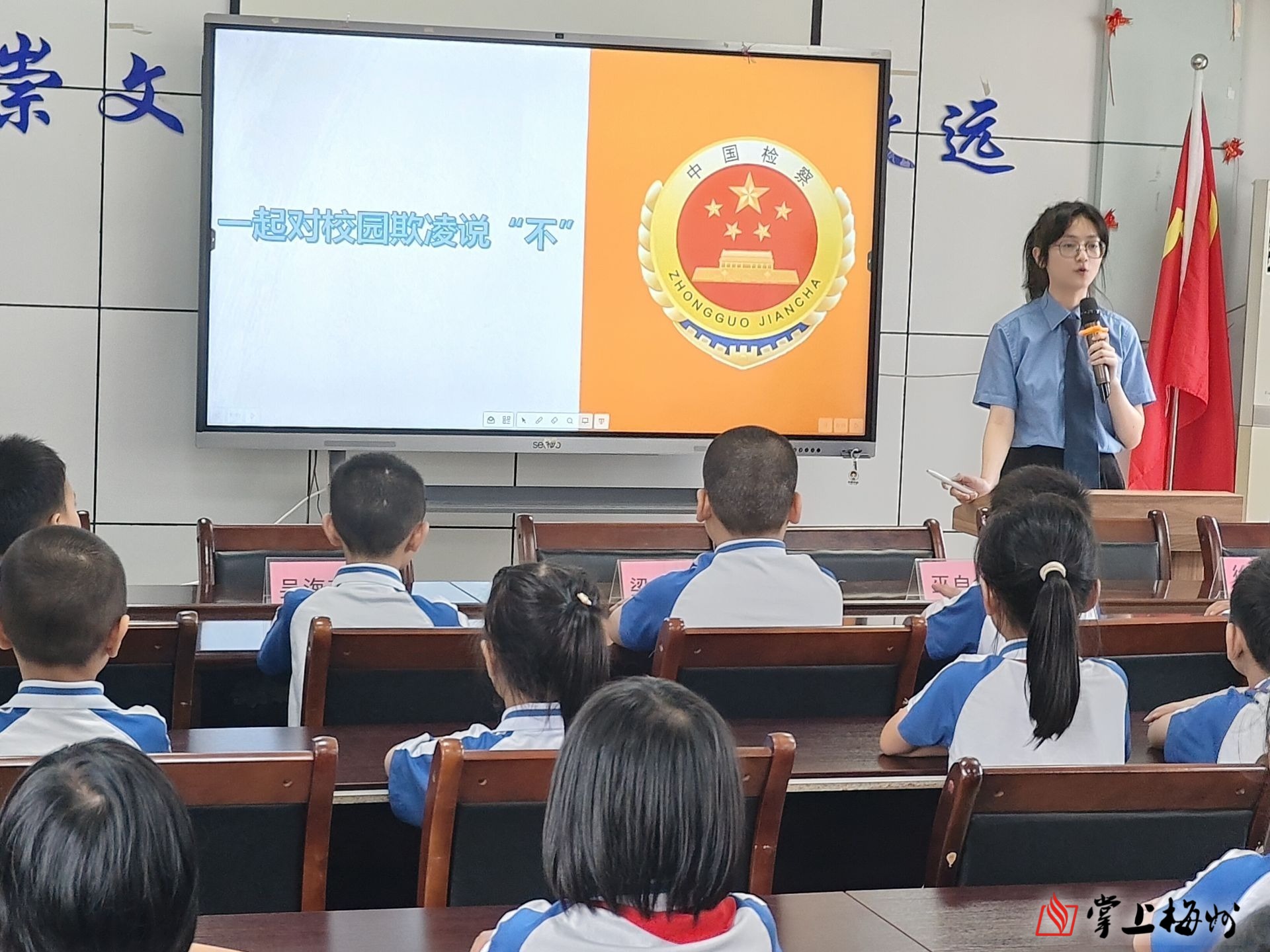 活动中,县检察院普法干警陈佳瑜结合小学生的特点,先后向全体小学生作了“一起对校园欺凌说不”和“网络安全进校园、守护好少年的你”二个专题的辅导课,以及做好小学生防溺水等工作。在讲课过程中运用发放普法资料、通俗易懂的理论讲述、观看短视频、现场互动提问等方式,给同学们上了一堂生动的普法教育课。同时,本次活动采取主会场上课、各班收看视频直播的形式,使全校1400多名学生同步接受教育,收到了预期的效果。