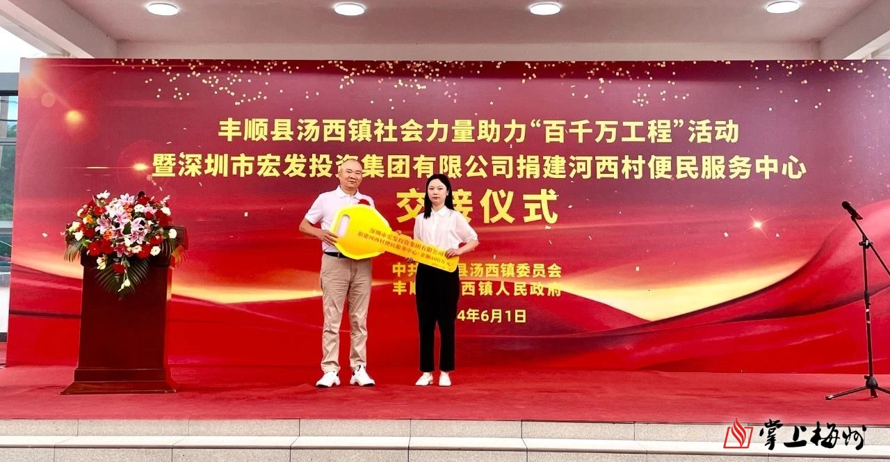 掌上梅州讯 6月1日,丰顺县汤西镇党委政府在河西村举行汤西镇社会力量助力“百千万工程”活动暨深圳市宏发投资集团有限公司捐建河西村便民服务中心交接仪式。