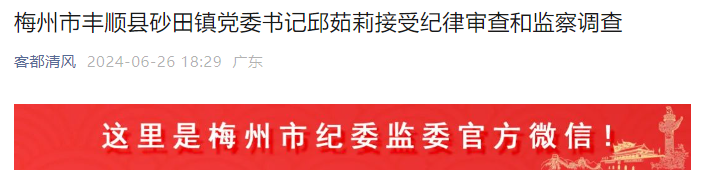 梅州市丰顺县砂田镇党委书记邱茹莉接受纪律审查和监察调查 2024-06-26 19:25 客都清风 0 梅州市丰顺县砂田镇党委书记邱茹莉涉嫌严重违纪违法,目前正接受梅州市丰顺县纪委监委纪律审查和监察调查。 编辑:黄炜明 审核:蔡颜颜