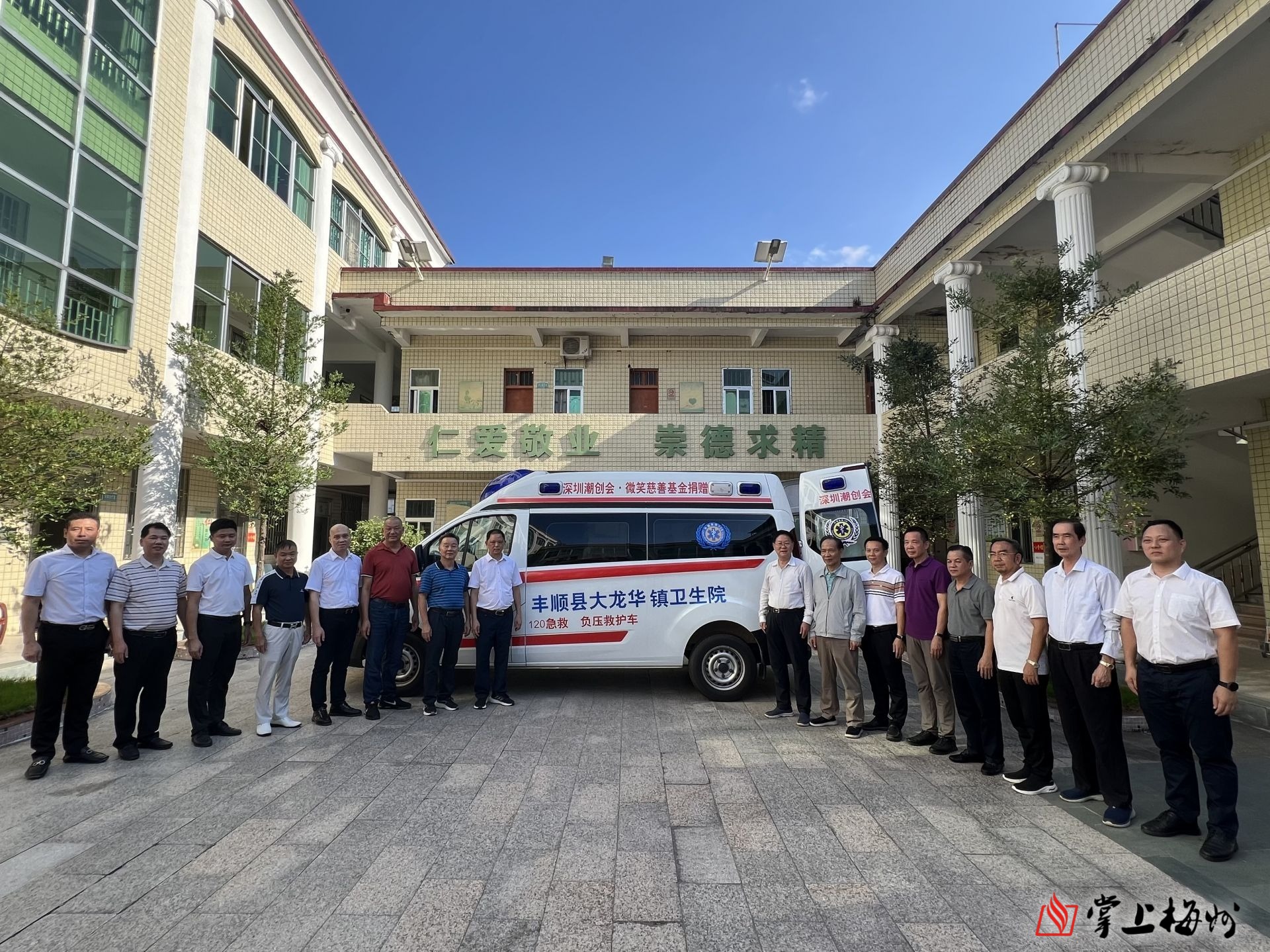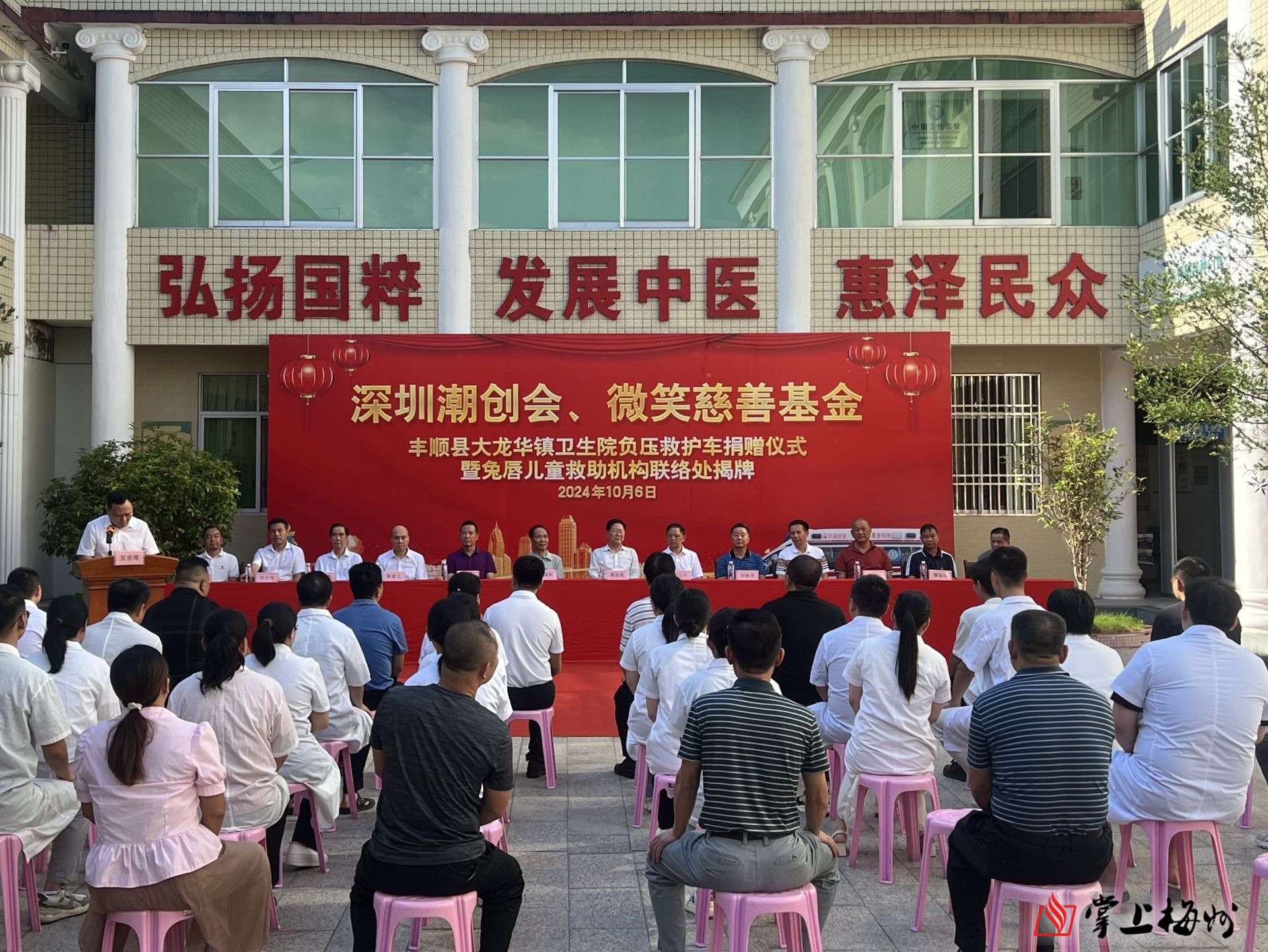 掌上梅州讯 10月6日,深圳潮创会、微笑基金会捐赠医疗救护车辆暨兔唇救助机构大龙华镇卫生院联络处揭牌仪式在丰顺县大龙华镇卫生院举行。深圳潮创会、微笑基金会长蔡文川,深圳市人大常委会原常务副主任谭国箱同志、原广东省国际关系调研室驻深办党委书记吴松峰同志、梅州市人大常委会原副主任胡国和同志、梅州市政协原副主席刘耿灵同志、深圳市热心乡贤谭国数先生、谭国深先生、朱雪云先生,丰顺县委常委、县委办主任石远平,县卫健局局长杨永亮、大龙华镇党委书记杜京杰,大龙华镇党委副书记、镇长刘坚等领导参加活动。