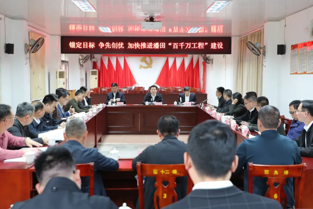 张志锋强调,“百千万工程”是牵动发展全局的关键之举,是关系长治久安的战略之举,是促进固本强基的务实之举。一要思想高度重视,扛起主体责任。潘田镇上下要深化思想认识,进一步增强工作责任感、使命感和紧迫感,把握机遇、锐意进取、苦干实干,推动“百千万工程”提质增效、争先进位。二要抓好班子队伍,凝聚工作合力。要履行好“一岗双责”,切实发挥“关键少数”作用,带头履职尽责、担当作为,充分调动全镇干部职工干事创业的积极性,共同营造“心往一处想、劲往一处使”的良好氛围。三要发展特色产业,壮大镇域经济。要因地制宜发展特色产业,培育壮大品牌产品,充分发挥“产业村长”带动作用,突出做好潘田米酒、米粉等文章,做强深加工、延伸产业链、提高附加值,持续拓宽优质农产品销售渠道,千方百计帮助村民增收致富。四要抓好镇村建设,提升风貌品质。要聚焦典型镇村建设目标任务清单,加强规划设计,形成尊重自然、传承历史、井然有序的合理布局;要持续推进农村人居环境整治,深化厕所、垃圾、污水“三大革命”,发动广大群众整治门前屋后卫生死角、乱堆乱放,全力消除“脏、乱、差”现象,加快补齐公共基础设施短板,拆建并举优化空间和功能,让城乡风貌美“颜”提“质”。五要深挖土地潜力,增强发展动能。深化全域土地综合整治,用好耕地占补平衡、城乡建设用地增减挂钩等政策工具,更好服务农业适度规模经营、基础设施和公共服务便民利民、产业集中布局和集聚发展。六要推进绿美建设,厚植生态底色。要坚持力度不减、标准不降、数量不少、质量要高,早作计划、早作安排,高质量做好做实今冬明春造林绿化工作。七要统筹发展安全,确保和谐稳定。要坚持和发展新时代“枫桥经验”,深化“1+6+N”基层社会治理工作体系,建立健全一站式、多元化矛盾纠纷化解机制,确保实现“小事不出村、大事不出镇”。要持续抓好重点场所、重点领域安全风险隐患排查整治,切实消除各类安全隐患,坚决防范恶性事件发生,确保人民群众生命财产安全。