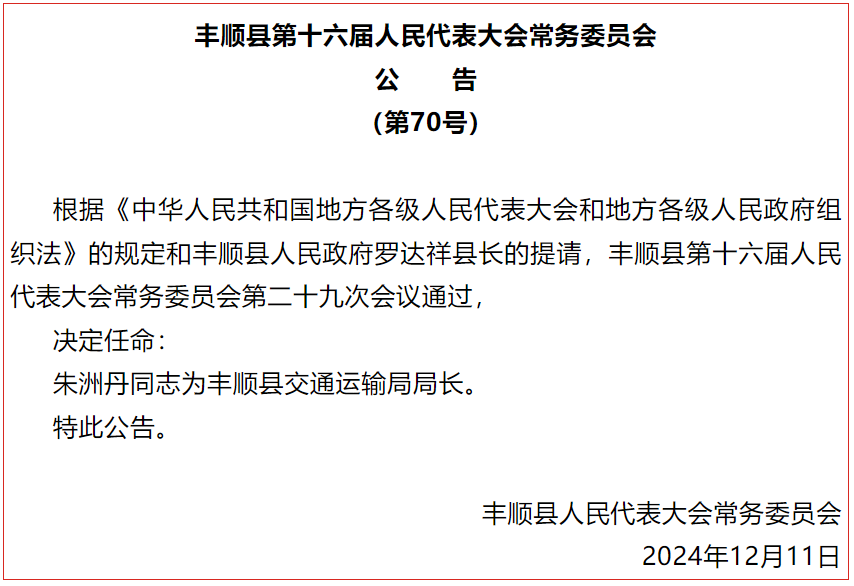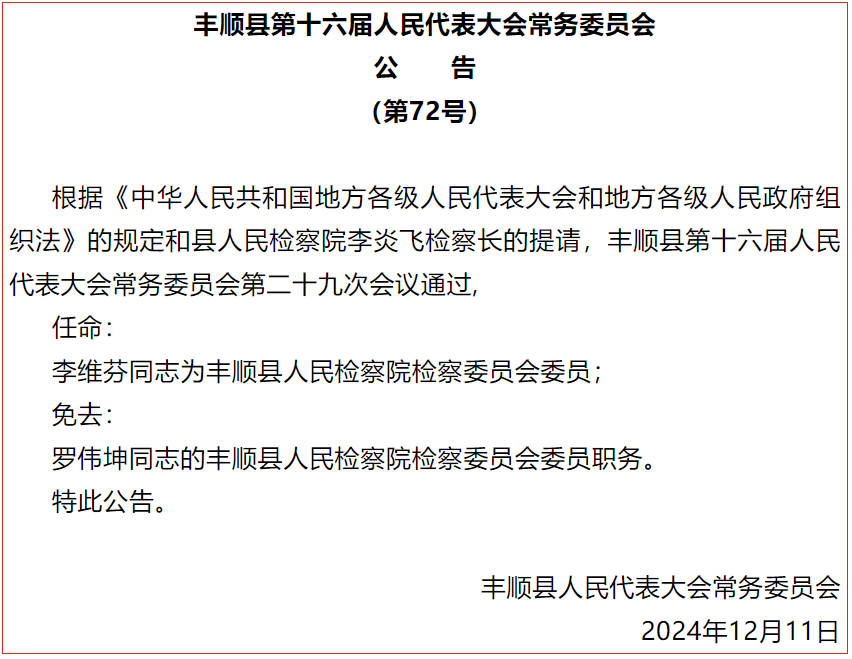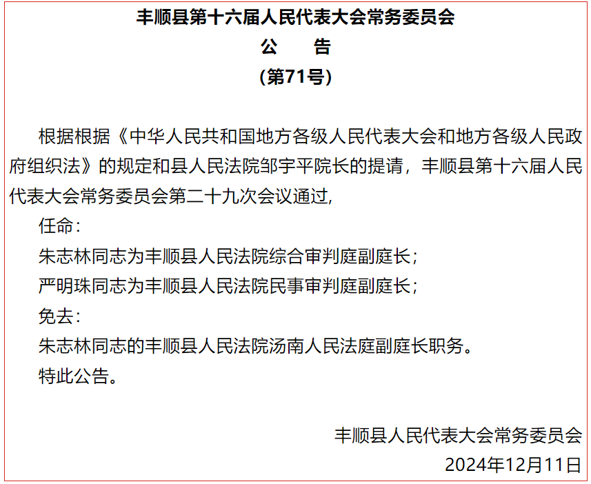 12月11日上午,丰顺县人大常委会主任邱翠茂主持召开丰顺县第十六届人大常委会第二十九次会议。丰顺县人大常委会副主任廖若旦、吴伟明、马扬闲、张良生、谢仕华,以及常委会其他组成人员出席会议;丰顺县副县长罗灏,丰顺县纪委副书记、丰顺县监委副主任朱传讯,以及丰顺县法院、县检察院、县府办、县财政局、县司法局等部门相关负责同志列席会议。