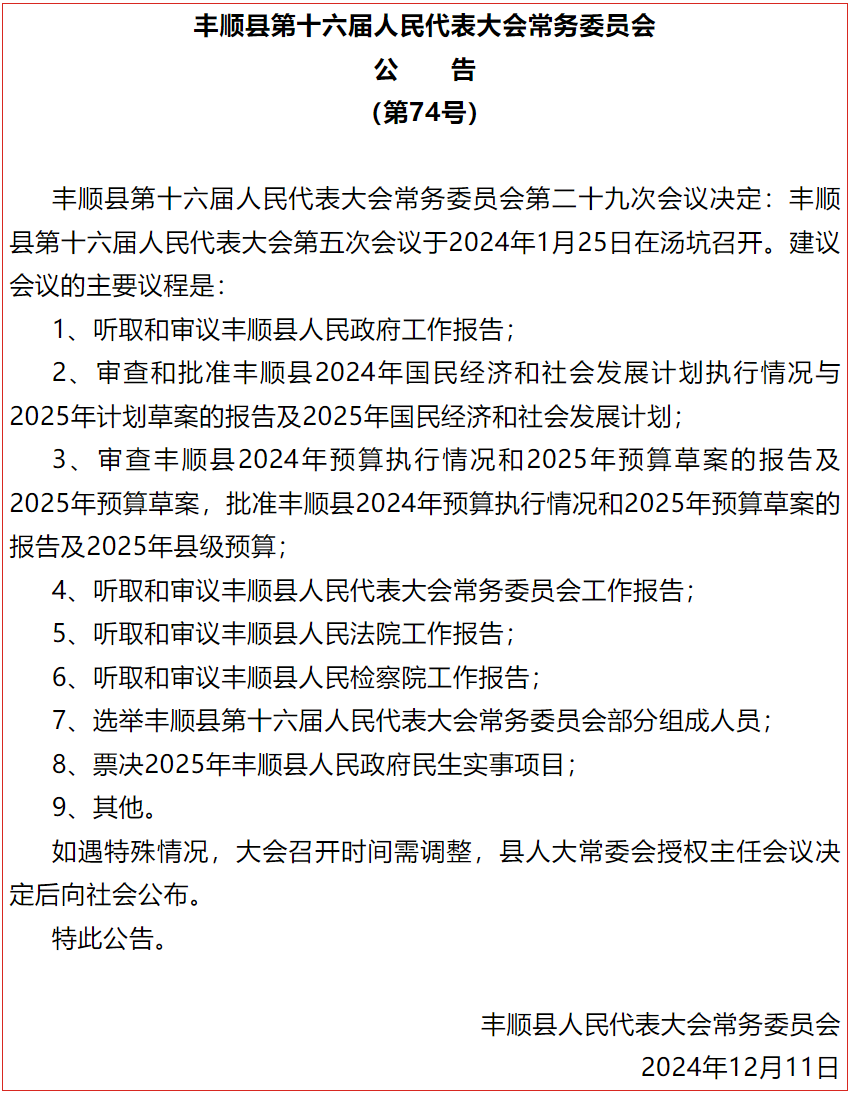 会议听取和审查丰顺县政府关于2024年县级财政第二次预算调整方案的议案(草案);听取和审议丰顺县政府关于丰顺县十六届人大四次会议代表建议办理情况报告;审议关于召开丰顺县第十六届人民代表大会第五次会议的决定(草案);听取和审议丰顺县人大常委会法制委关于2024年规范性文件备案审查工作的报告;审议决定人事任免等事项。