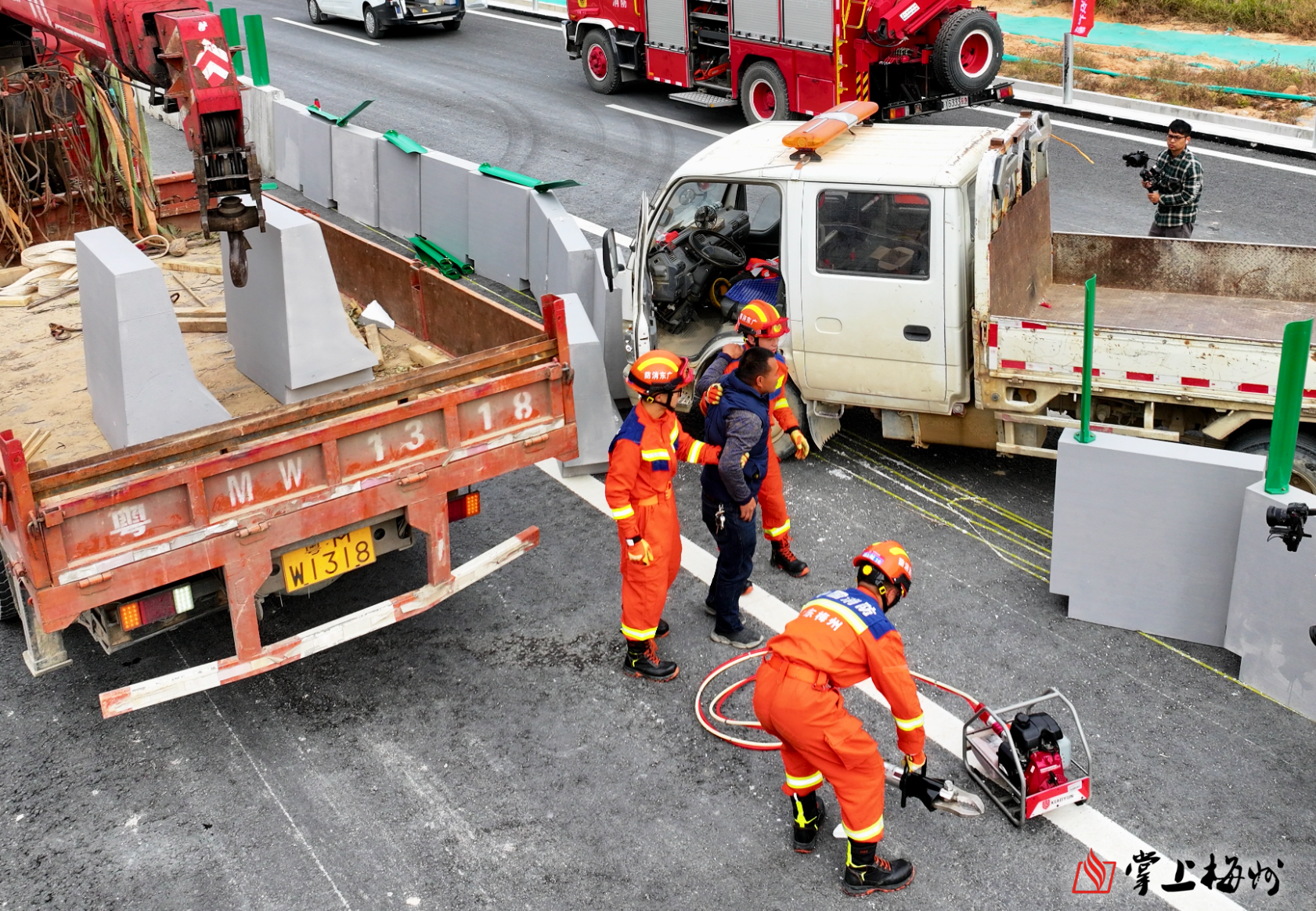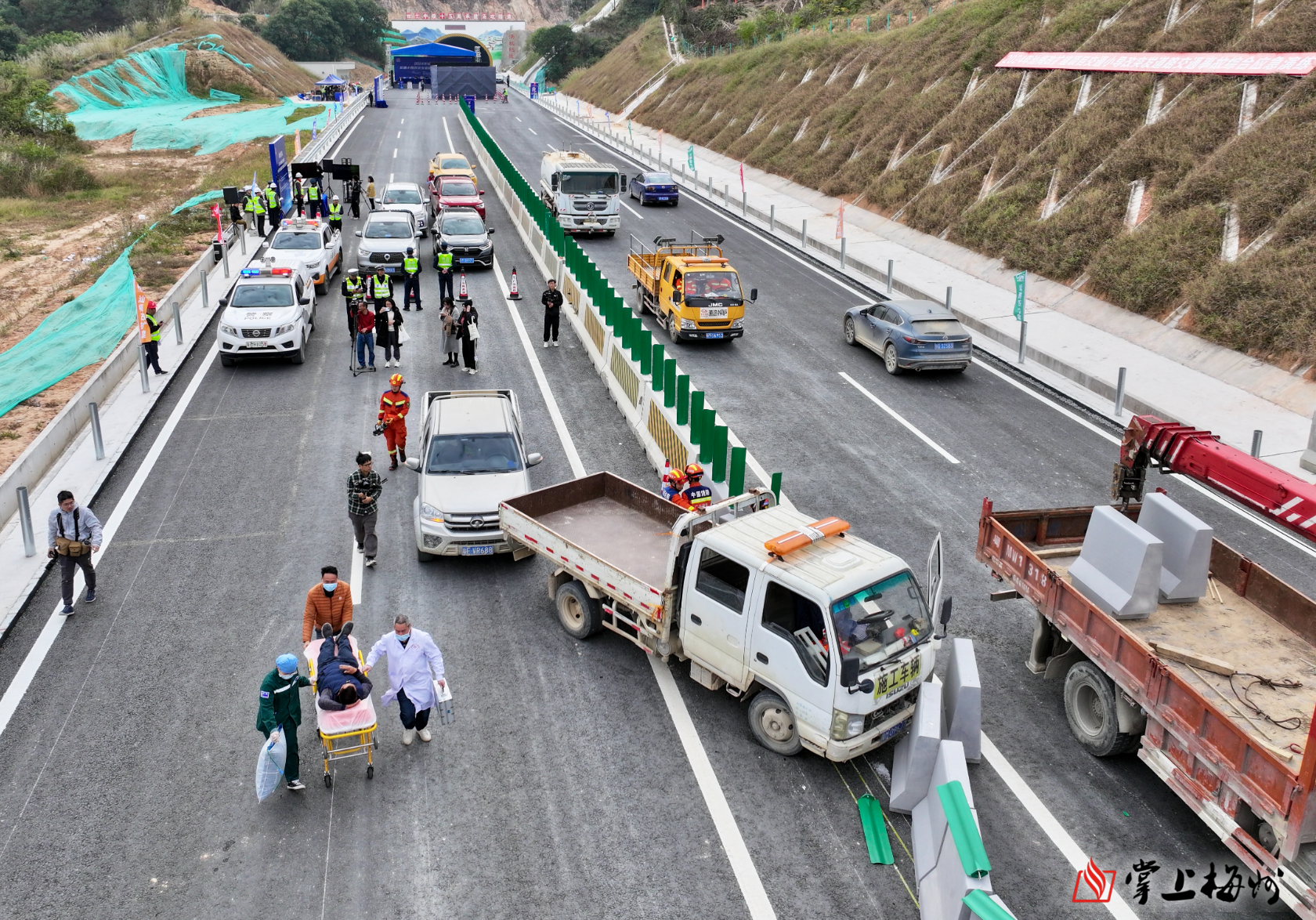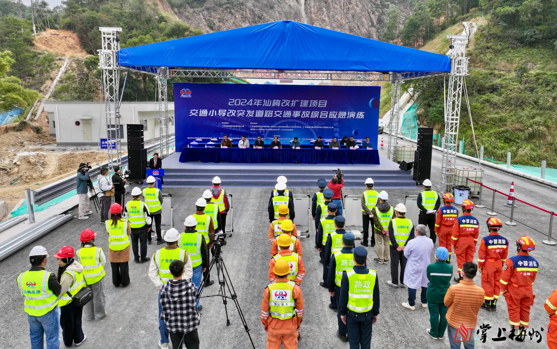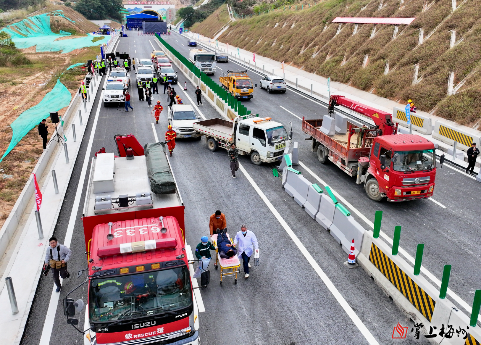 掌上梅州讯 18日上午,2024年汕梅改扩建项目交通小导改突发道路交通事故综合应急演练在丰顺汤坑隧道出口举行。