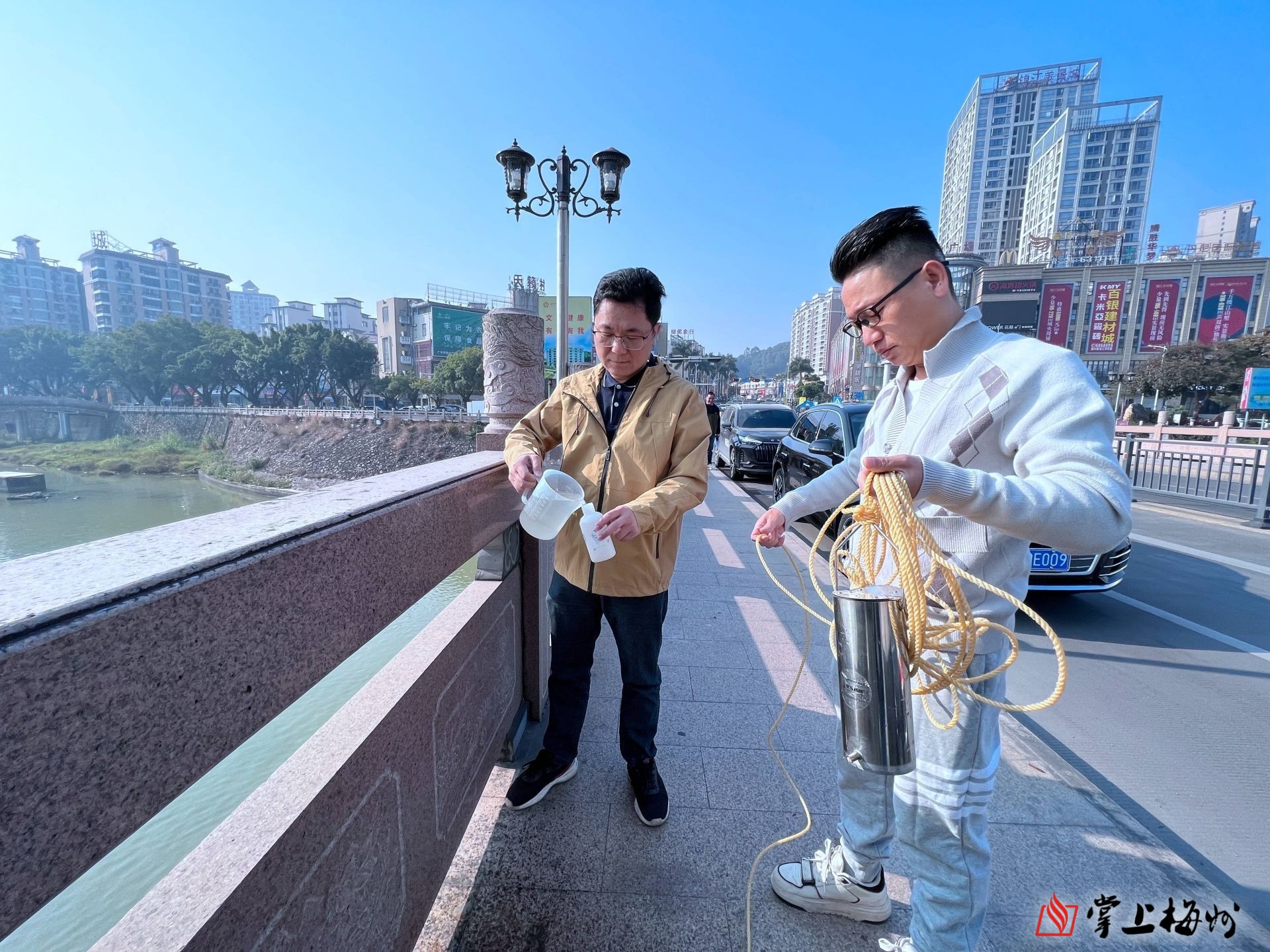 在黄埔桥附近的采样点,梅州市丰顺生态环境监测站工作人员当天例行对水质进行采样。(王锐 摄)
