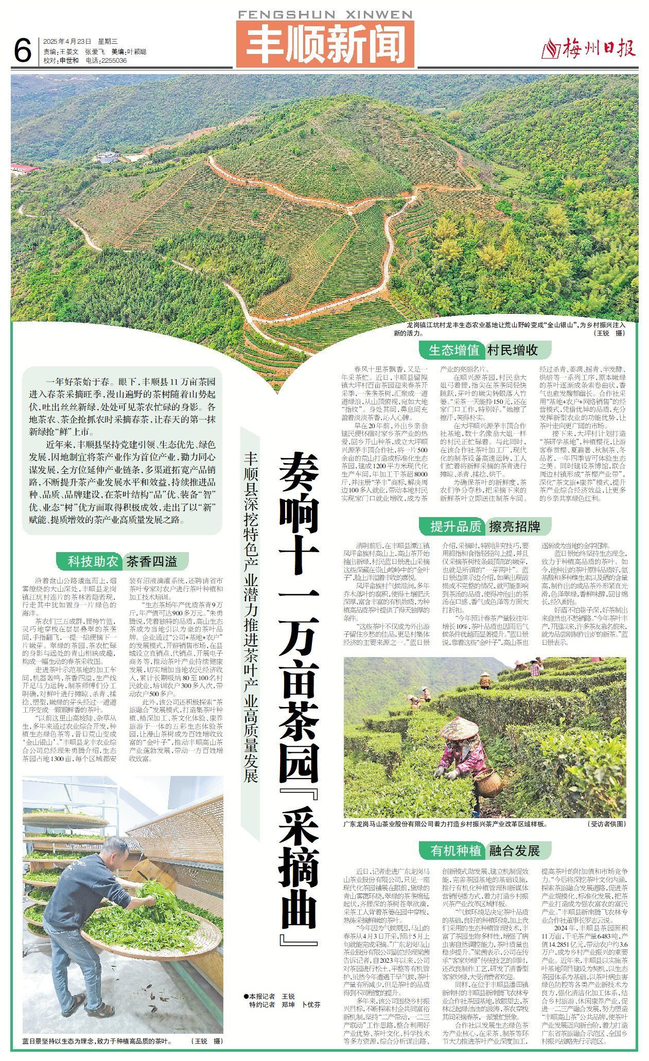 同样,在位于丰顺县潘田镇新南村的丰顺县新南腾飞农林专业合作社茶园基地,放眼望去,茶林泛起绿油油的波涛,茶农穿梭其间采摘春茶,一派繁忙景象。