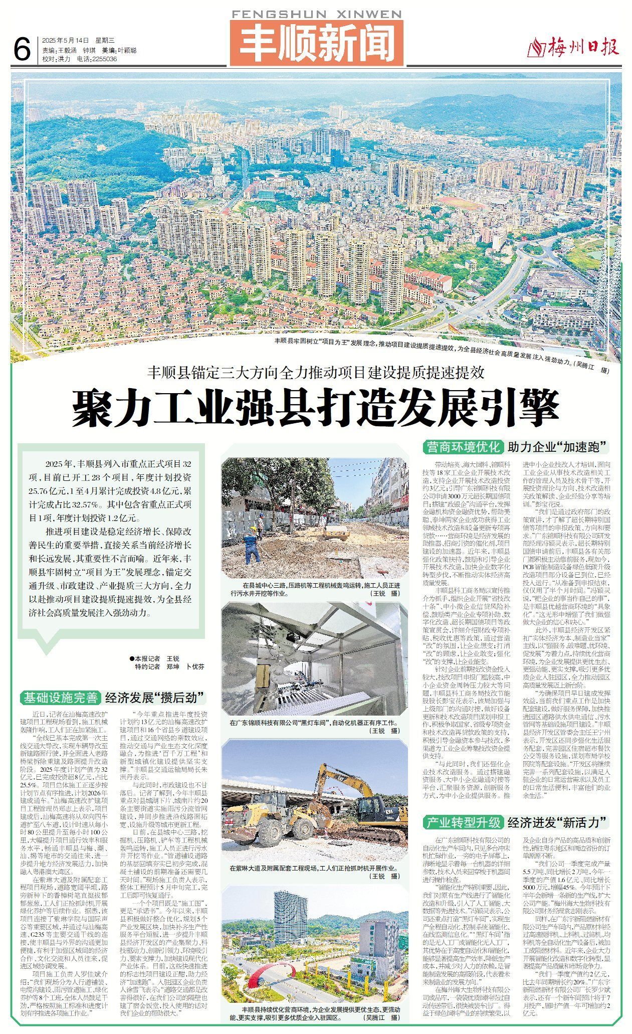 一个个项目既是“施工图”,更是“承诺书”。今年以来,丰顺县积极做好整合优化,规划5个产业发展区块,加快补齐生产性服务平台短板,进一步提升丰顺县经济开发区的产业集聚力、科技驱动力、创新引领力、环境吸引力、要素支撑力,加快建设现代化产业体系。目前,这些快速推进的标志性项目建设正酣,助力经济“加速跑”。入驻园区企业负责人徐雪飞表示:“道路交通都是改善得很好,在我们公司的隔壁也建了宿舍饭堂,投入使用的话对我们企业的帮助很大。”