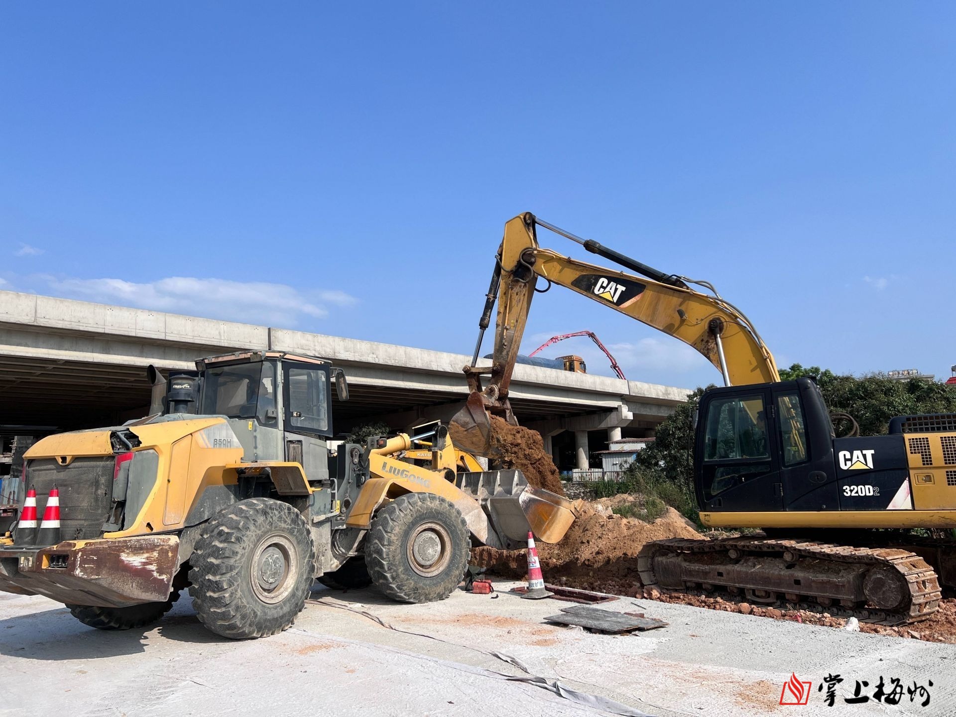 近日,记者在汕梅高速改扩建项目工程现场看到,施工机械轰隆作响,工人们正在加紧施工。