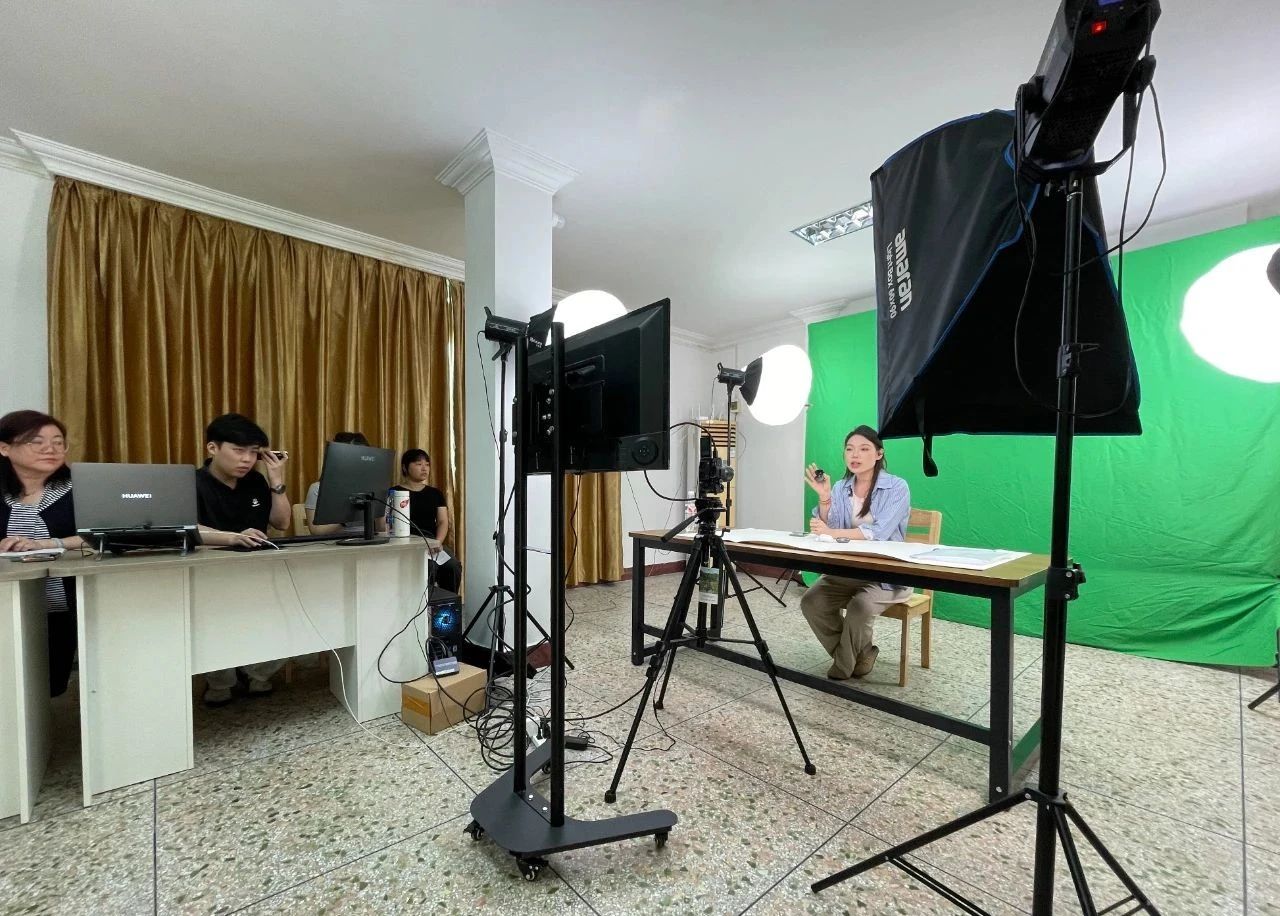 潭江镇政府跃达科技展销室宽敞明亮,一张张崭新的办公桌整齐有序地摆放着,成像设备、光控设备等直播设备一应俱全,水电及网络等基础设施配置周全。