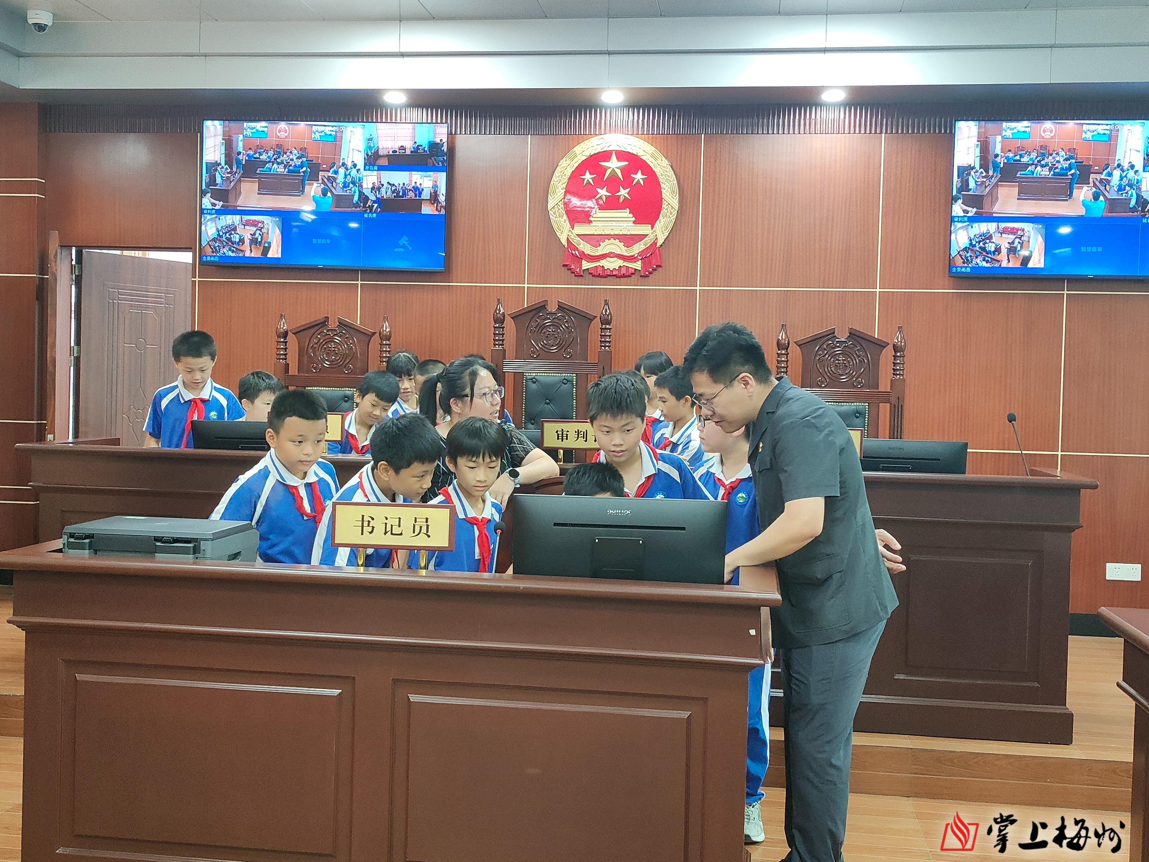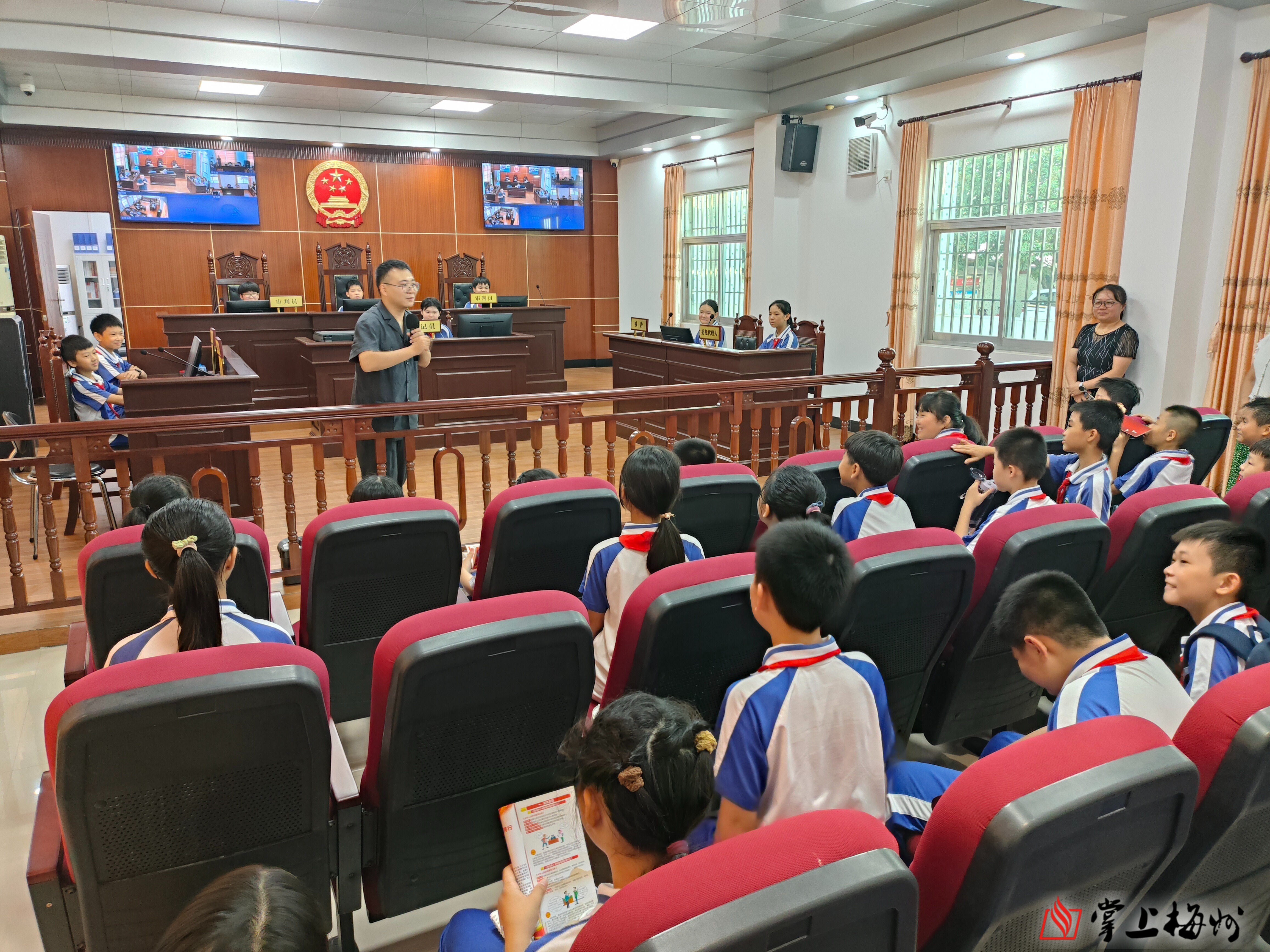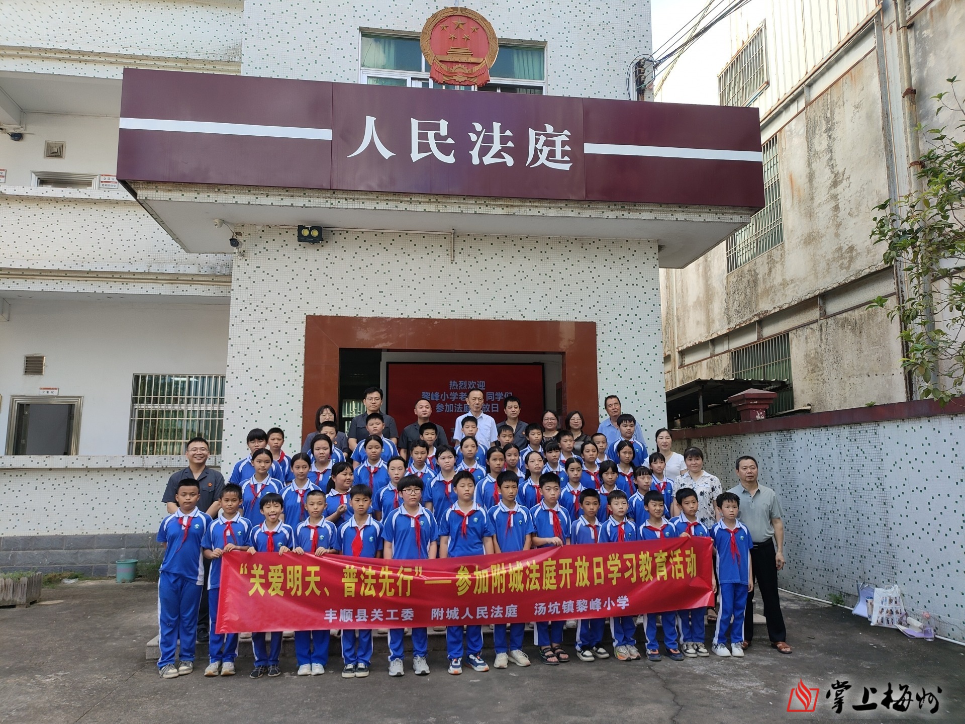 掌上梅州讯 6月27日,丰顺县关工委联合汤坑镇黎峰小学,组织学生到附城人民法庭,参加以“关爱明天、普法先行”为主题的法庭开放日学习教育活动。县关工委主任巫自华、副主任黄晓阳,县人民法院审判管理办公室主任徐略军、法官助理刘志威,附城法庭副庭长陈洋聪、法官助理兼法治宣讲员徐丹枫,以及黎峰小学师生共60多人参加活动。
