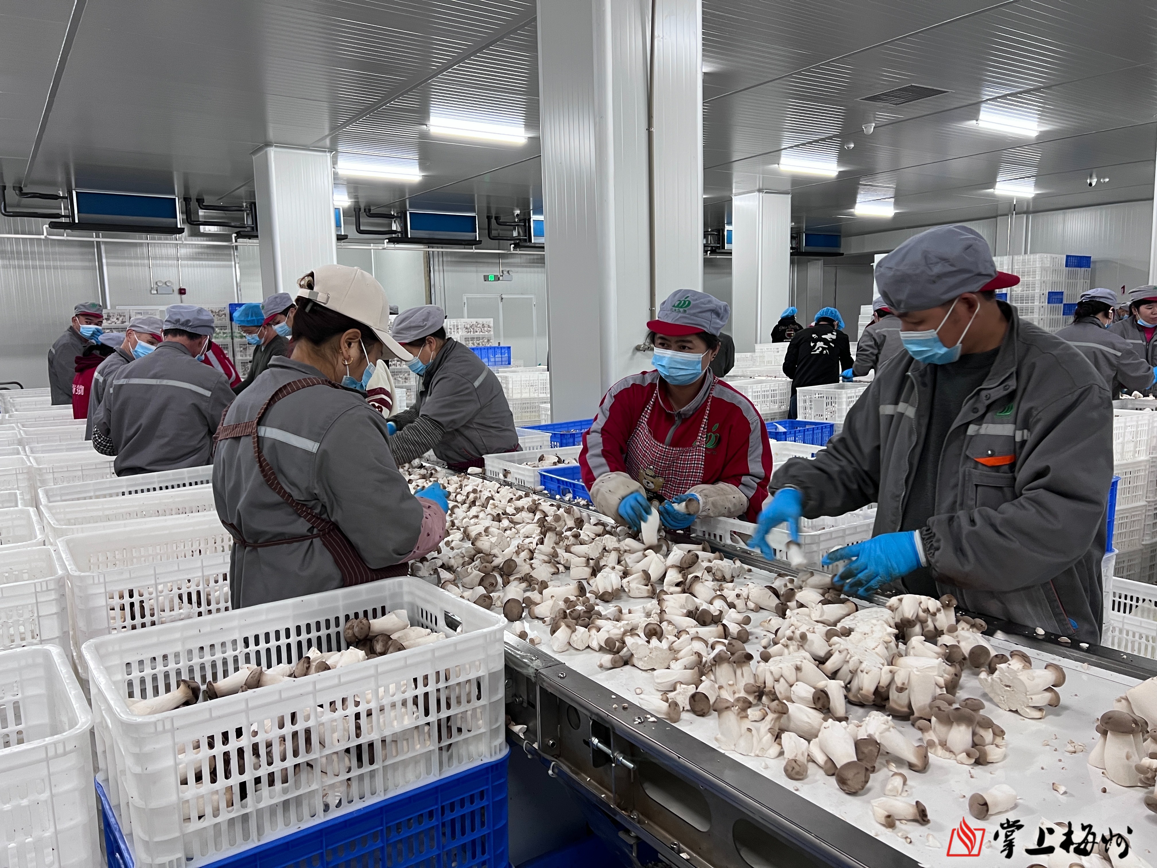 代米食品的成品包装车间里,工人们在挑选杏鲍菇。
