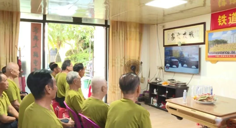 同样沉浸在激动氛围中的,还有铁道兵十师退役的丰顺战友们。上午,老兵身着印有“铁道兵”字样的纪念衫,围坐在一起观看直播盛况。当镜头扫过威武的受阅方队、先进的武器装备,现场不时响起阵阵热烈掌声。