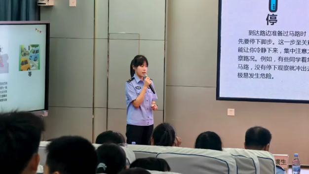 9月8日上午,民警来到丰顺县实验小学,通过讲解PPT、发放交通安全宣传手册、播放警示教育片等方式,以案说法,向学生们普及“一盔一带”的重要性,提醒学生们乘坐电动车时要正确佩戴安全头盔、乘坐小汽车时要系好安全带,以真实案例让同学们深切体会到安全出行不容懈怠。